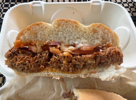 This was a good sized sandwich; though I thought the bollilo was a bit over-baked; the crust crumbly. But the bread was nice and yeasty, held up well, and the shredded pork was pretty good.