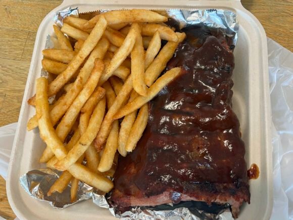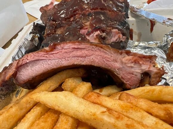 The ribs were decent, not very much smokiness as you can tell by the lack of a smoke ring. The meat was very moist, though I should have asked to have the commercial grade BBQ sauce separate.