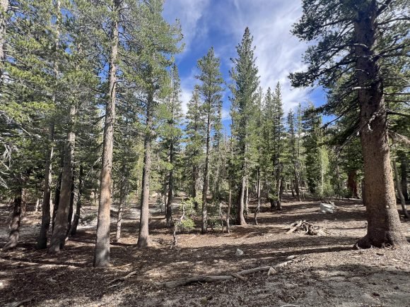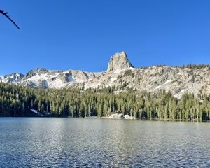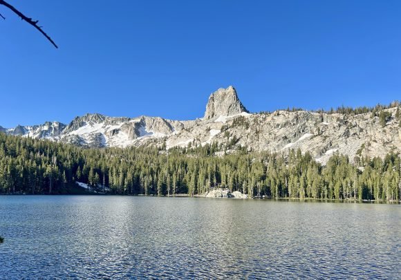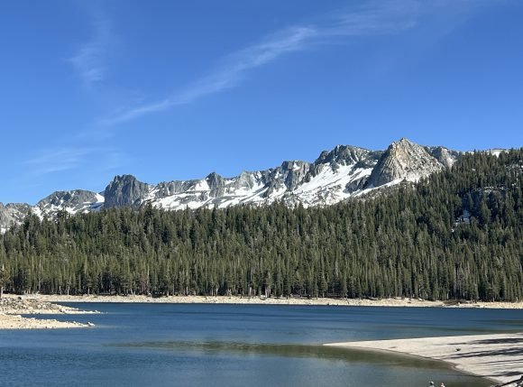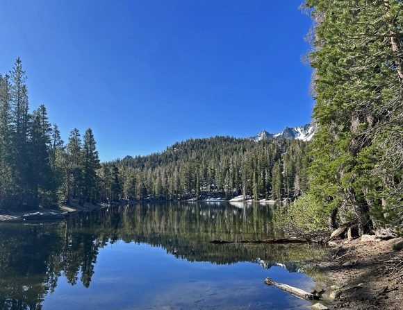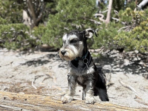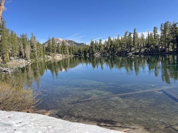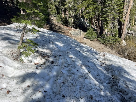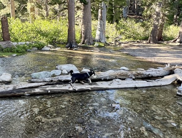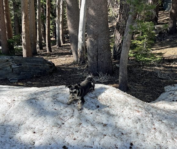 The Missus was so excited to be in Mammoth…She couldn’t wait to take JJ hiking. And so first thing in the morning we headed out. She had decided on doing the Skelton Lake Loop, which started at the large parking lot at Coldwater Creek Road. This was an interesting hike as there was still snow and ice at some parts of the trail. It was only 3 1/2 miles long, but seemed longer. What we did find out on this trail was that JJ loved snow….