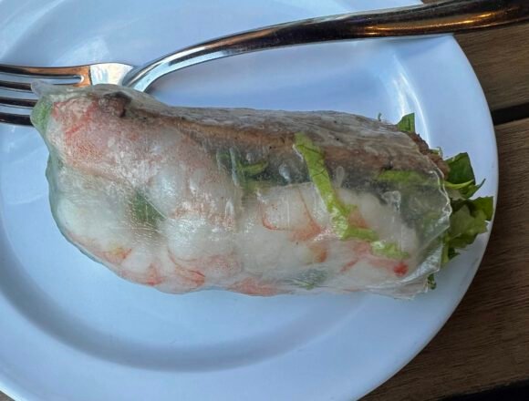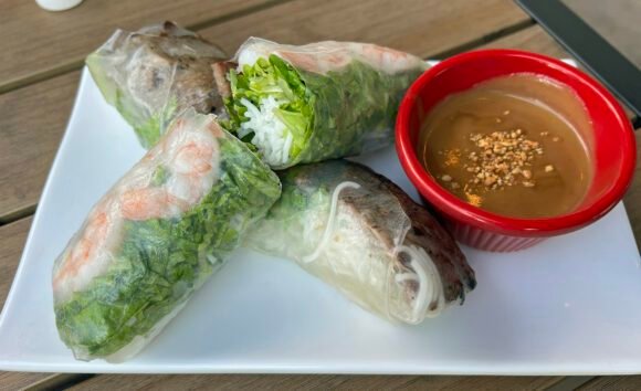 Huge amount of vermicelli noodles and lettuce….no mint or cilantro in sight. The wrapper was super chewy, the peanut sauce on the sweeter side.