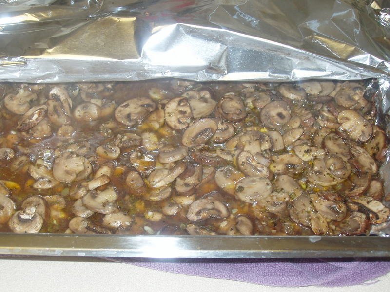 Place all ingredients in a baking pan, mix together, cover well, and roast at 325 degrees for 45 minutes. Cool in liquid and refrigerate, mushrooms will last up to 1 week in a covered container.