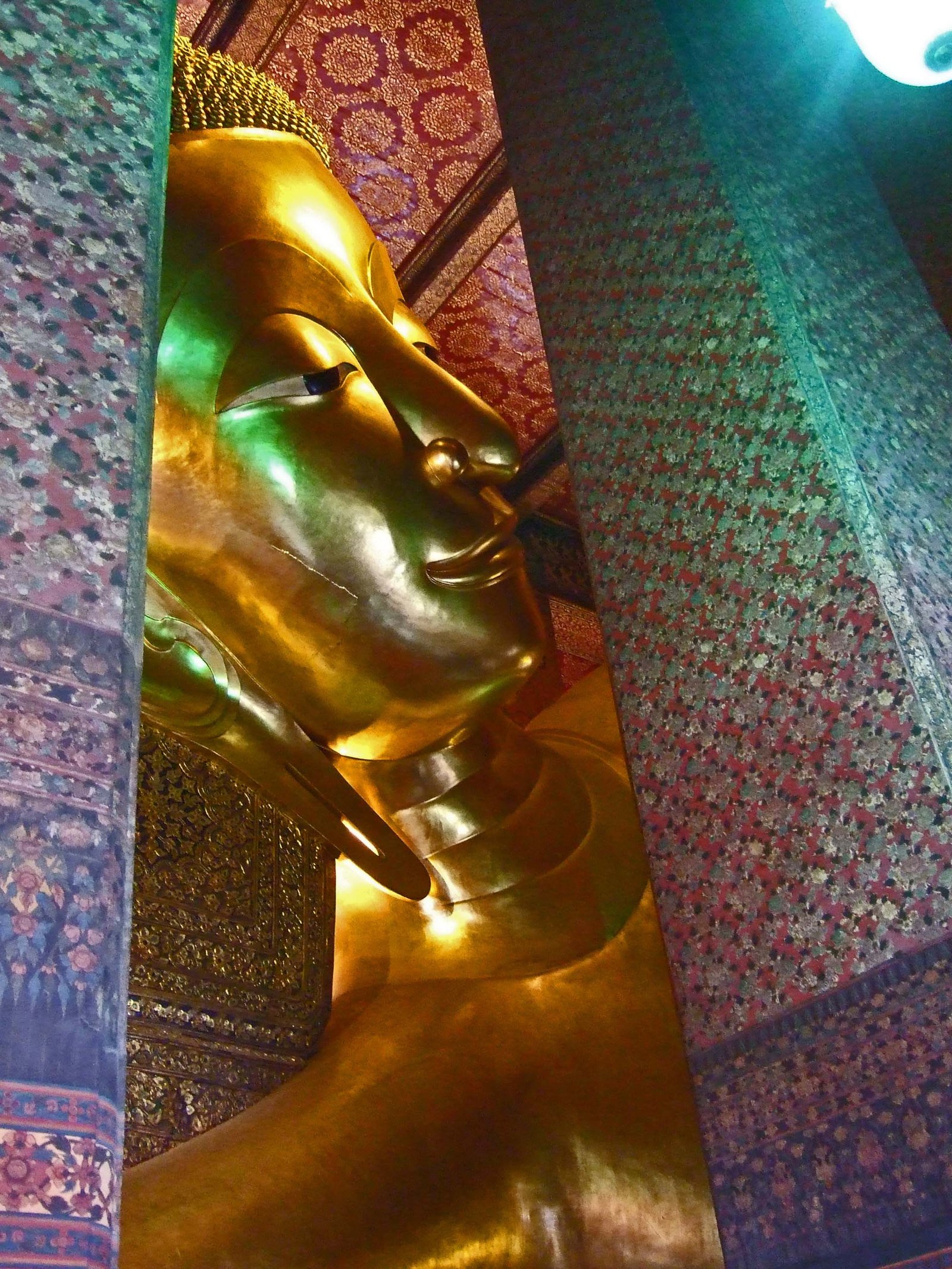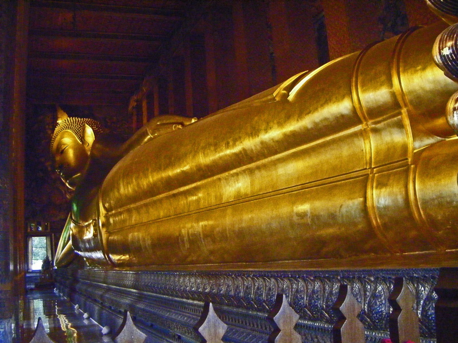 We left, skirting the Palace walls, and made our way to Wat Pho(Temple of the Reclining Buddha). After paying the 50 Baht admission, we entered the main building. Prepared to be underwhelmed, I turned to the Missus and said, "ok, where's the reclining Buddha?" To which the Missus replied, "just turn around stupid….." I turned, and my jaw hit the floor….