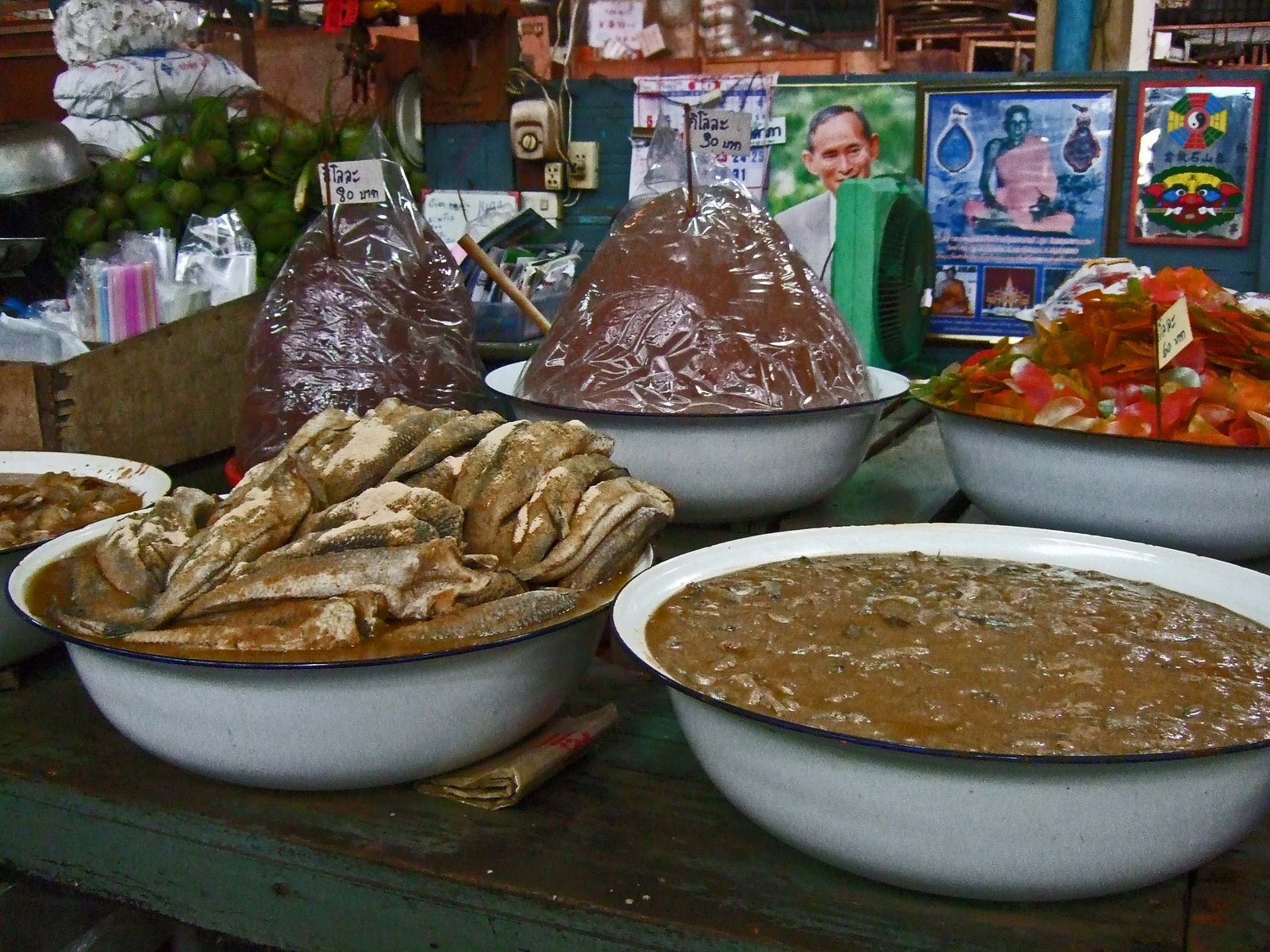 A quantity of seafood in various levels of fermentation, and barrels of dried shrimp, fish, and squid.