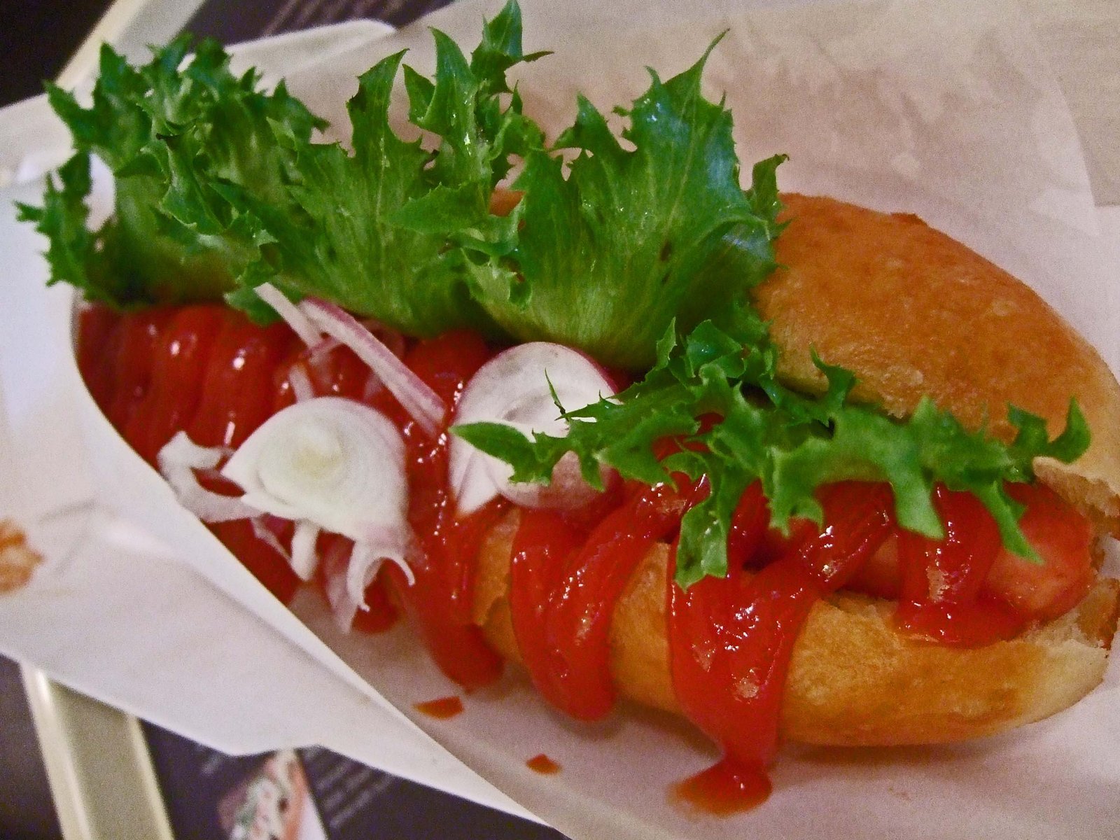 It was a pretty large dog, long and thin, with a natural casing, but very little flavor….add to that the fact that I still can't get behind the idea of ketchup on a Hot Dog…though the Missus likes Her dog that way. What I really enjoyed was the bun….it was light, the crust was crisp, the bread a bit sweeter, but not too sweet….must be that collagen magic at work! And since we all know that collagen is the "glue which holds our body together" I had the added satisfaction of knowing that none of my limbs, or other body parts for that matter, would suddenly decided to take leave…my mind on the other hand, well, that's another story.