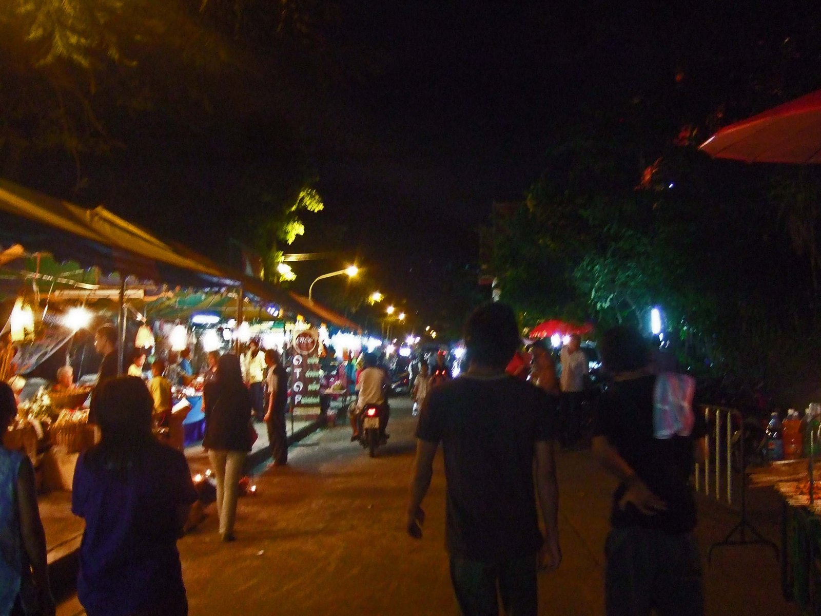 Finally, after what seemed forever…….our flight left for Udon Thani. One quick note on AirAsia, the flights are cheap, but as with any budget carrier, they will try to squeeze every Baht they possibly can from you…from charging for water (10 Baht), to charging for checking luggage. Luckily, the Missus and I were traveling light…..only carry on for us. The original plan was to arrive in Udon Thani at arround 4pm; catch a Tuk Tuk to the Bus Depot, and catch the bus to Nong Khai, which resides on the Thailand – Laos border. This way we'd make it into Nong Khai before dark. Unfortunately, our flight was delayed, and night falls like a dark, black curtain in this part of the world. We arrived to darkness, and the Missus was feeling a tad uncomfortable…..after a brief discussion I made an executive decision; we'd catch the shuttle from the airport to Nong Khai, and take our chances. Most of the folks getting on the shuttle were headed straight for the Friendship Bridge…the Lao border. We decided to get a good night's sleep…..in need of a destination, I muttered the only Guest House I knew of in Nong Khai….they very popular Mut Mee. We arrived to a driveway in almost pitch black darkness….but the really nice driver pointed down the pitch-black driveway, and smilingly said, "Mut Mee…down there". And, yes it was. We could hear the muttering of voices as well approached the end of the drive way….we made a turn, and arrived at a little desk fronting a kitchen area. A fellow with a British accent (Harps) greeted us with, "you are pretty late..…" And went one about the scarcity of rooms…..call it good timing if you will, but we arrived during the Bun Fai Phaya Naga, the Naga Fireball Festival. During the full moon of the 11th month, a mysterious event occurs in Nong Khai….mysterious fireballs arise out of the Mekong River…legend has it that mythical serpents create the fireballs. So, would we be able to get a room? Harps looked at us and apologetically said: "I'm sorry..…but it has been very busy….thousands of people. Even one of the Princesses visited! So the only thing we have is Julian and Pao's suite…and it is rather expensive…660 Baht a night." Are you kidding me? Less than 20 bucks a night…sold! Harps guided us over to the "suite"….and we freshened up…..(more on Mut Mee in a future post). Harps had also mentioned the festival, telling us it was about a 20 minute walk along the Mekong…and we could hear music playing. And soon enough we saw this from our front window: