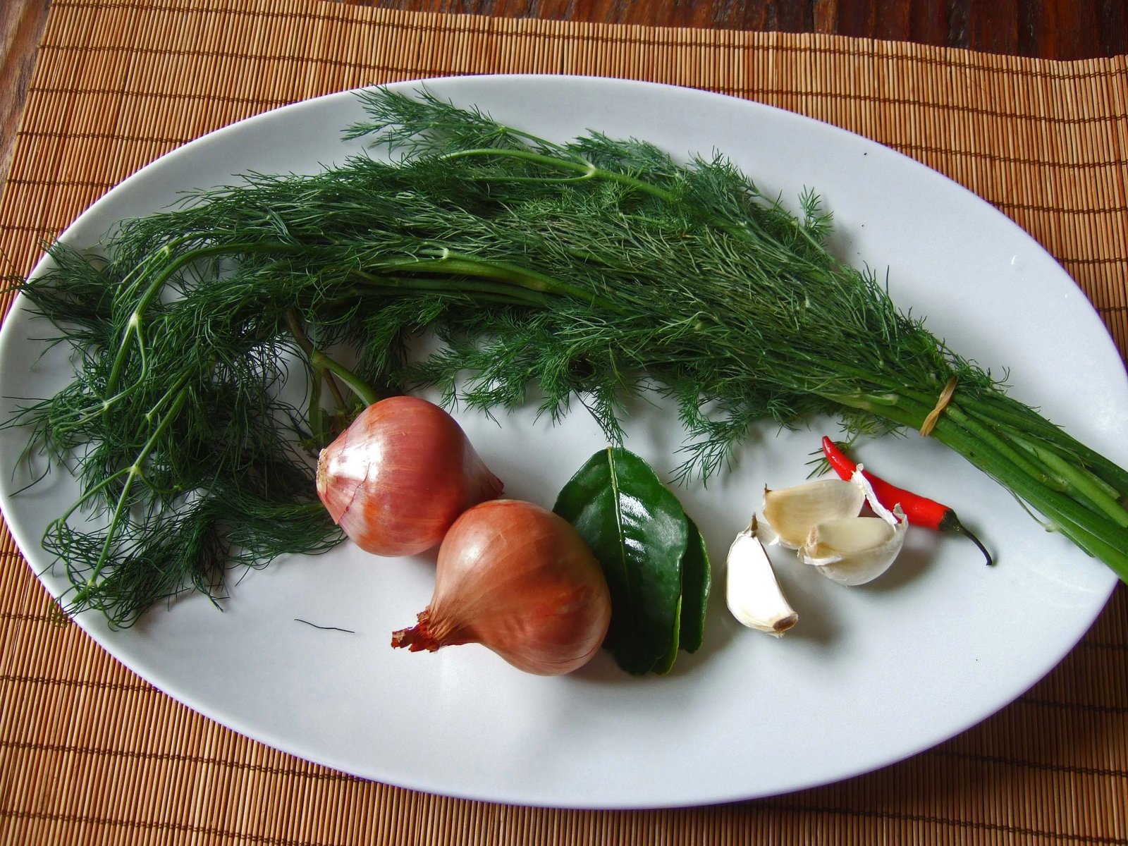 1 – In a mortar combine 1TB salt, garlic, shallots, chilies, kaffir lime leaves, and pound into a paste.