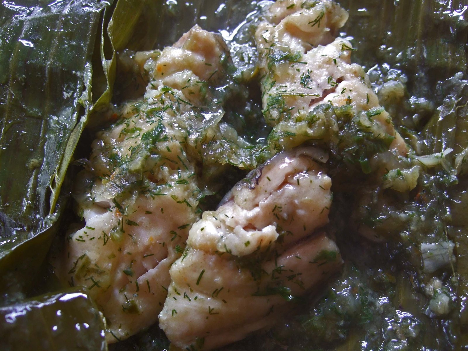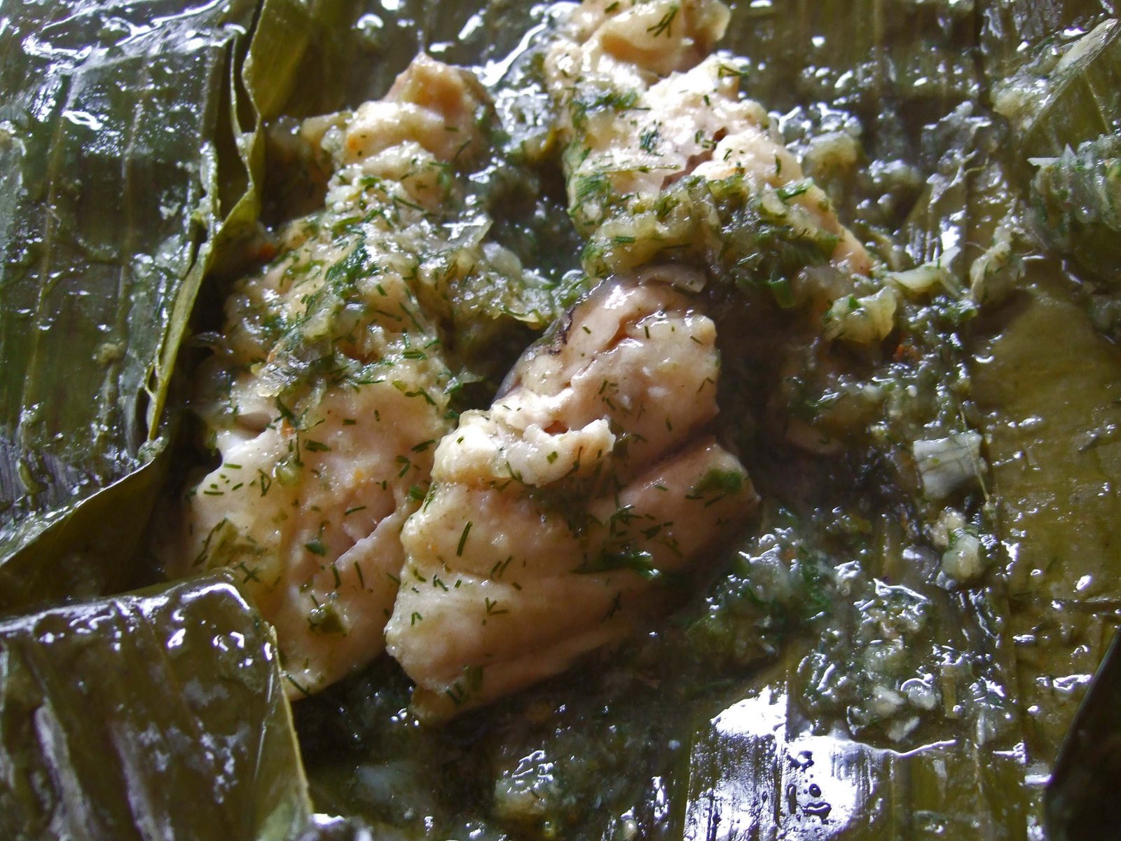 7 – You can either place 2 banana leaves over each other at right angles, place fish in the middle, and pour on some of the paste. OR if you're like me, and all thumbs, just fold the darn thing up, sealing well.