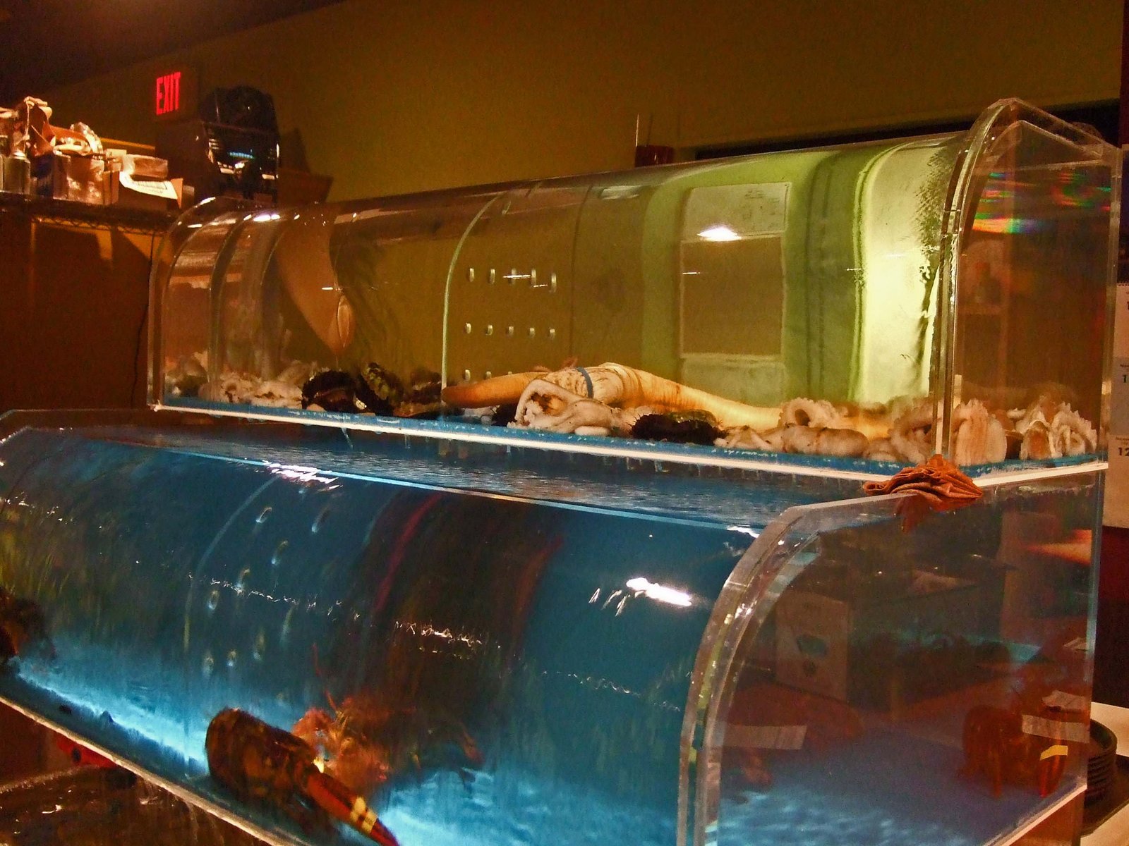 But early on this evening, I arrived, in a much more relaxed state. I took in the rather small sushi bar (7 seats), and the large tank of live seafood residing right next to it.