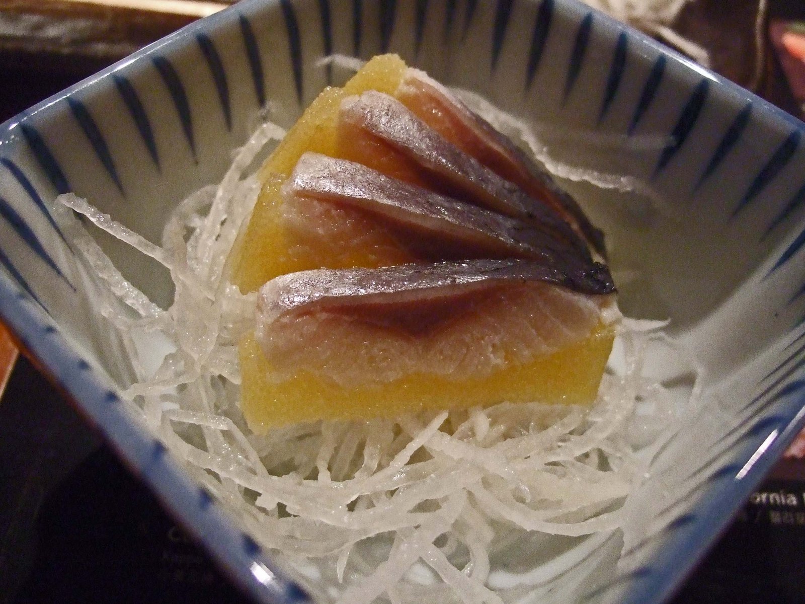 I couldn't identify it readily…it was what the Japanese call Hikarimono ( "Shiny meat", Bluefish). So what was it? Sam told me it was Sanma (Pacific Saury), somthing I'd never had as nigiri or sashimi before. I enjoy Sanma, but it's usually been Sanma Shioyaki(salt grilled) or simmered. I enjoy the strong flavored, oil-rich, sanma, but wasn't quite sure what this would be like. Sam told me: "Kirk-san, fresh from Japan, it would be a waste to grill". And he was right! Served in this manner, the soul of the sanma was captured, rich, almost buttery, with the sometimes strong flavor of the sanma toned down. Excellent!