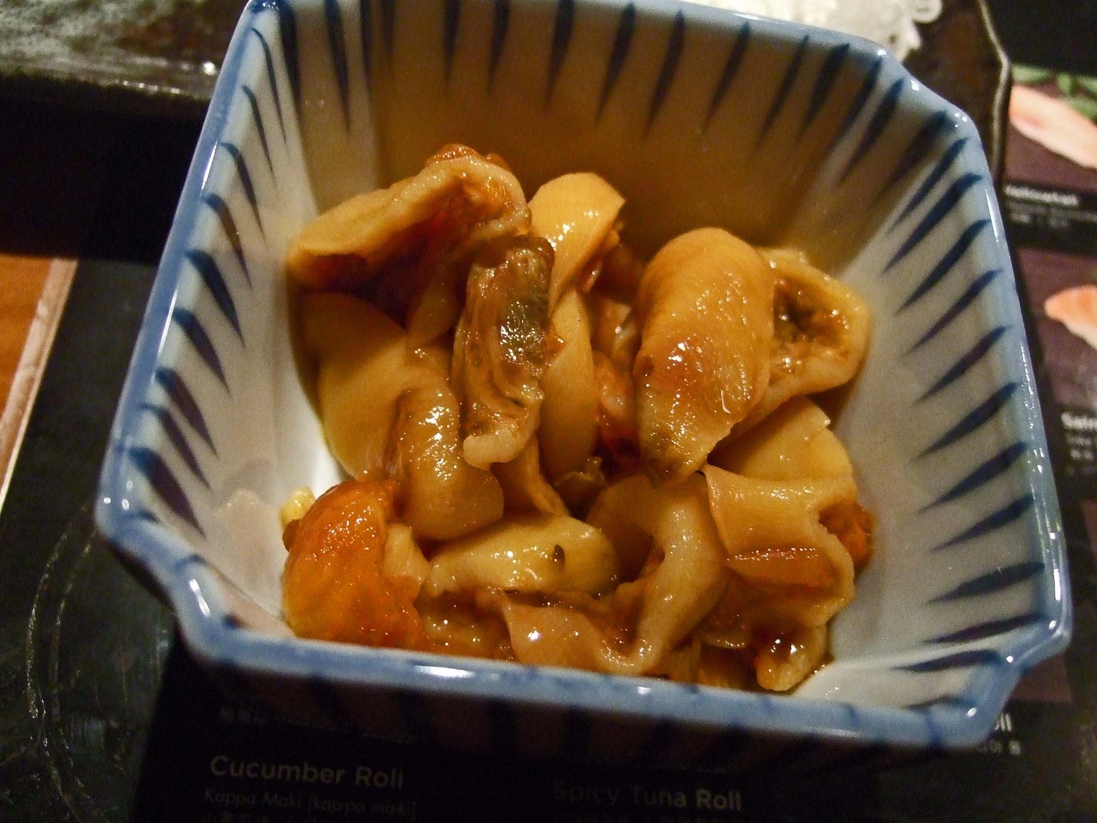 Known in Japanese as "Hoya", I've had these before, and have never been a big fan. There are folks who brag about finding these in various San Diego sushi bars, but not me. Still, put it in front of me…. My previous experiences were confirmed as not being flukes. This stuff to me has a astringent, iodine flavor, which I find unpleasant. The best version of this I've had was served as panchan. Which is what I did…pour even more Cho-Jang over the crunchy-chewy (again with the textures) flesh.