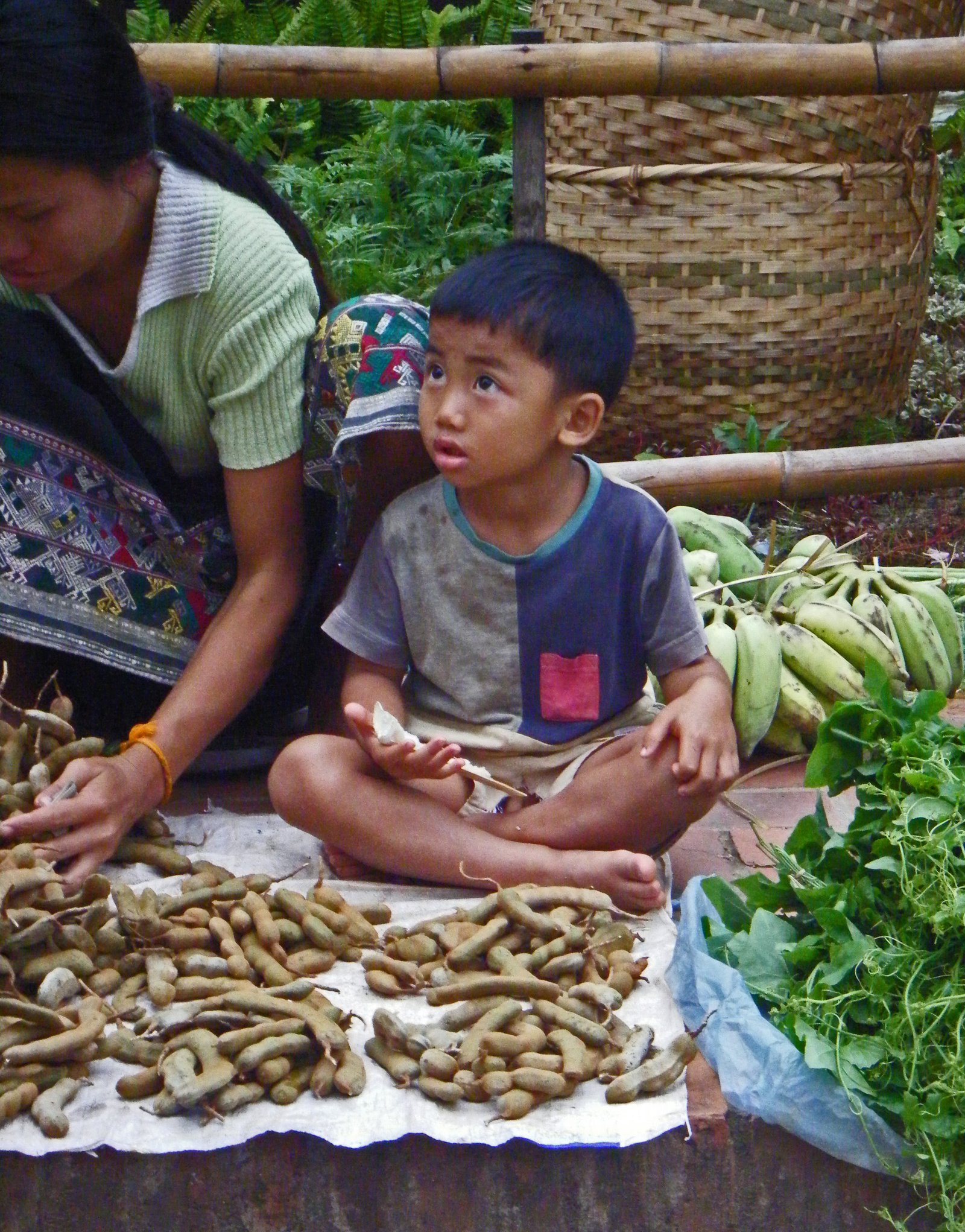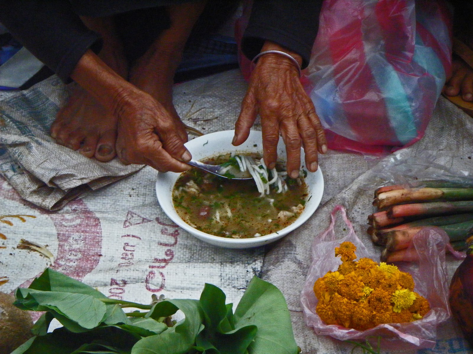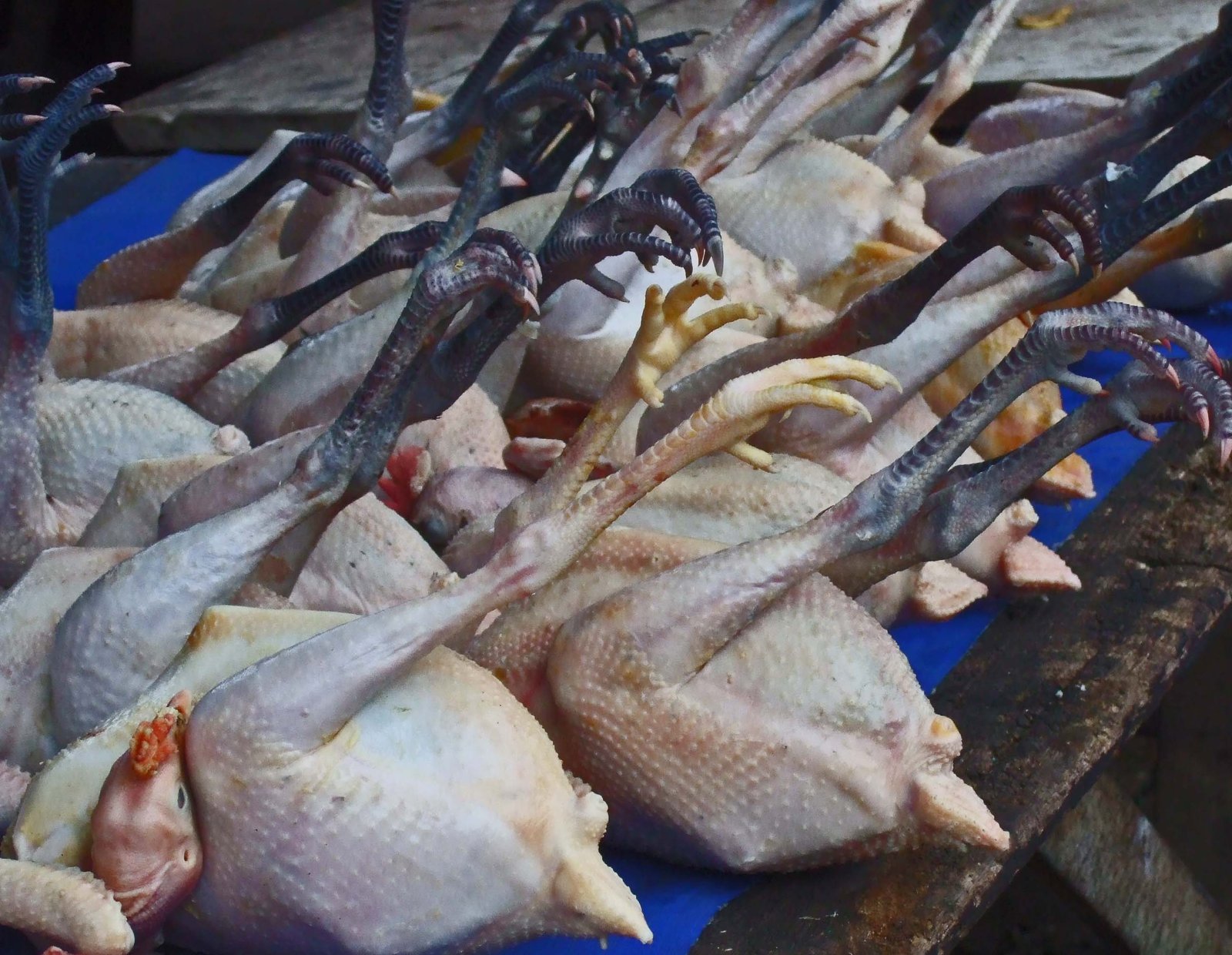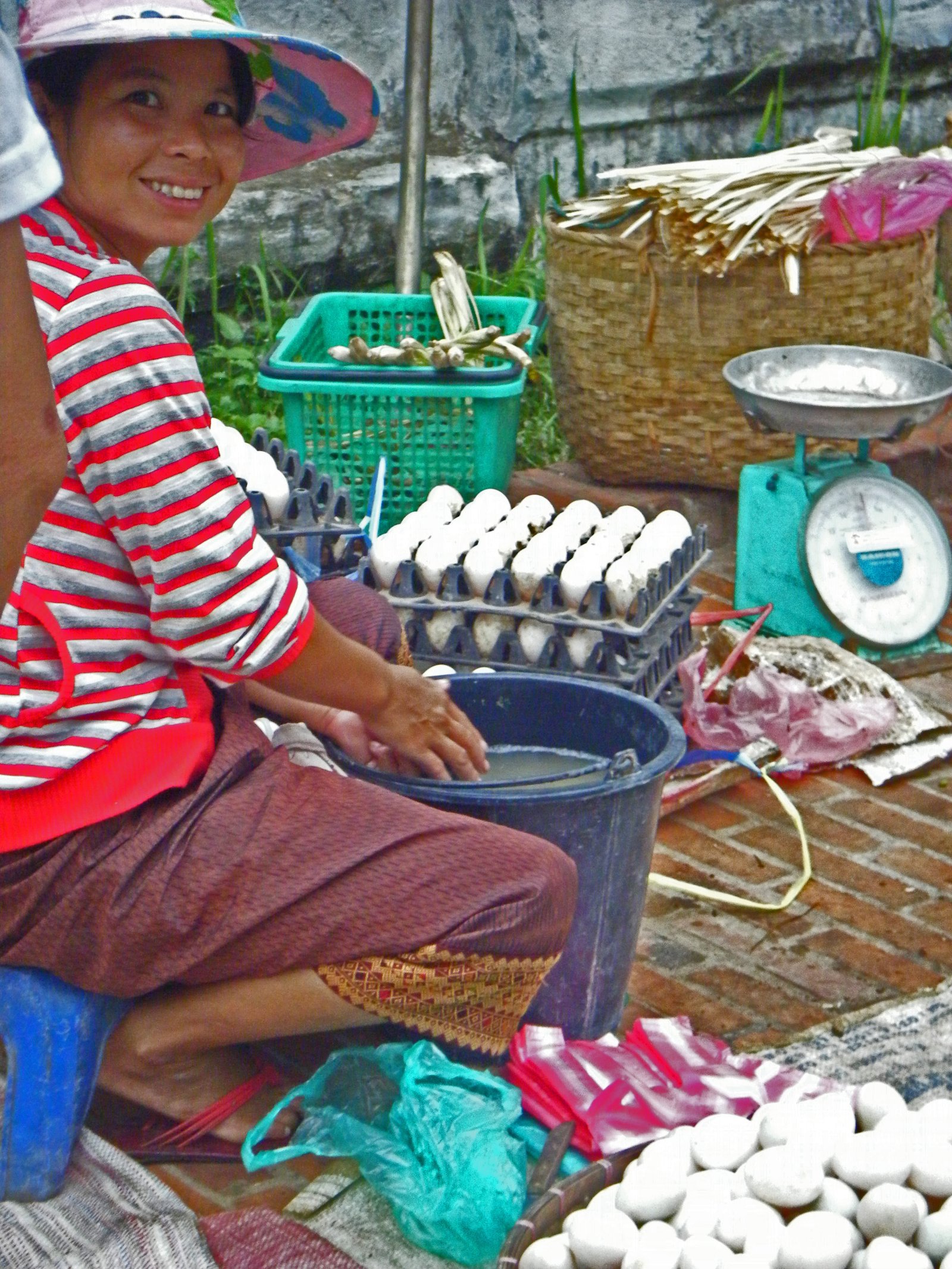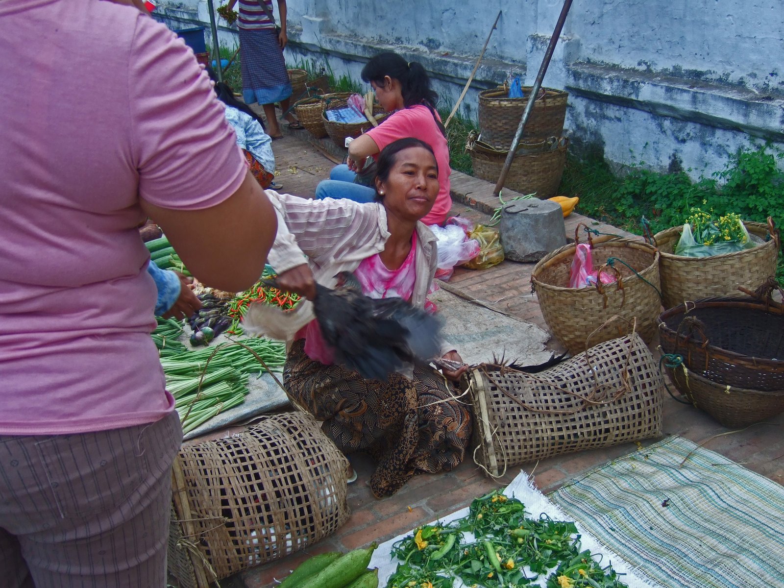 This woman sold live poultry, which were kept in baskets. Inquire about one of her chickens, she'd quickly pull one out of the basket in a smooth motion for inspection.