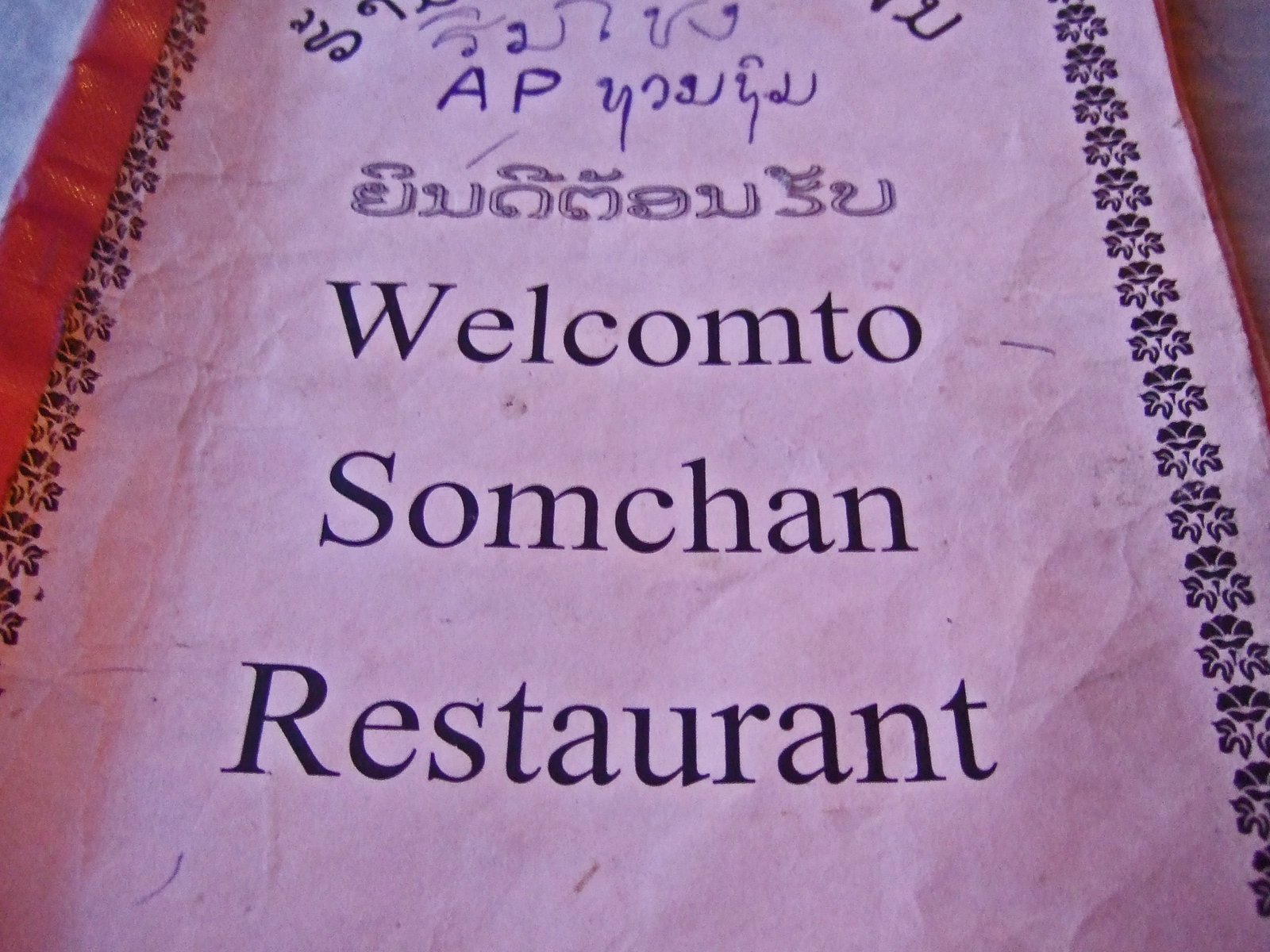 Hi Beach – It is the Lao – “Lenglish” translation. The big sign in the front says Somchan, some of the menus say Somchan, that sign says Somchanh, some of the menus say Somchanh, on the map it says Somchan. To-may-to/To-mat-to??? ;o)
