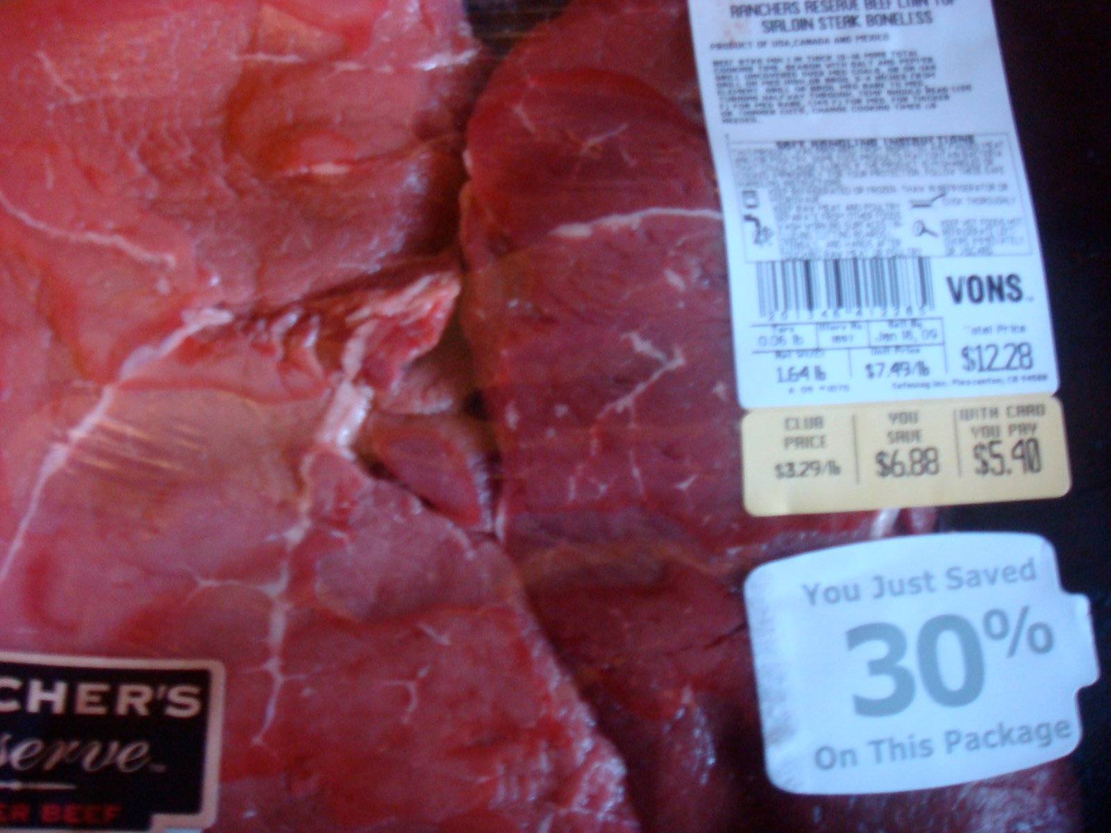 Welcome to the comment side of the blog, ddhac. I haven’t seen an episode of Good Eats since before Thanksgiving-I’ve been busy with stuff. I do learn a lot from that show though. The bulk pack of top sirloin was on sale for $2.99/lb at Vons, but early in the morning, around 7, the smaller packs of meat and fish have markdowns (you can see where the 30% off sticker was removed).