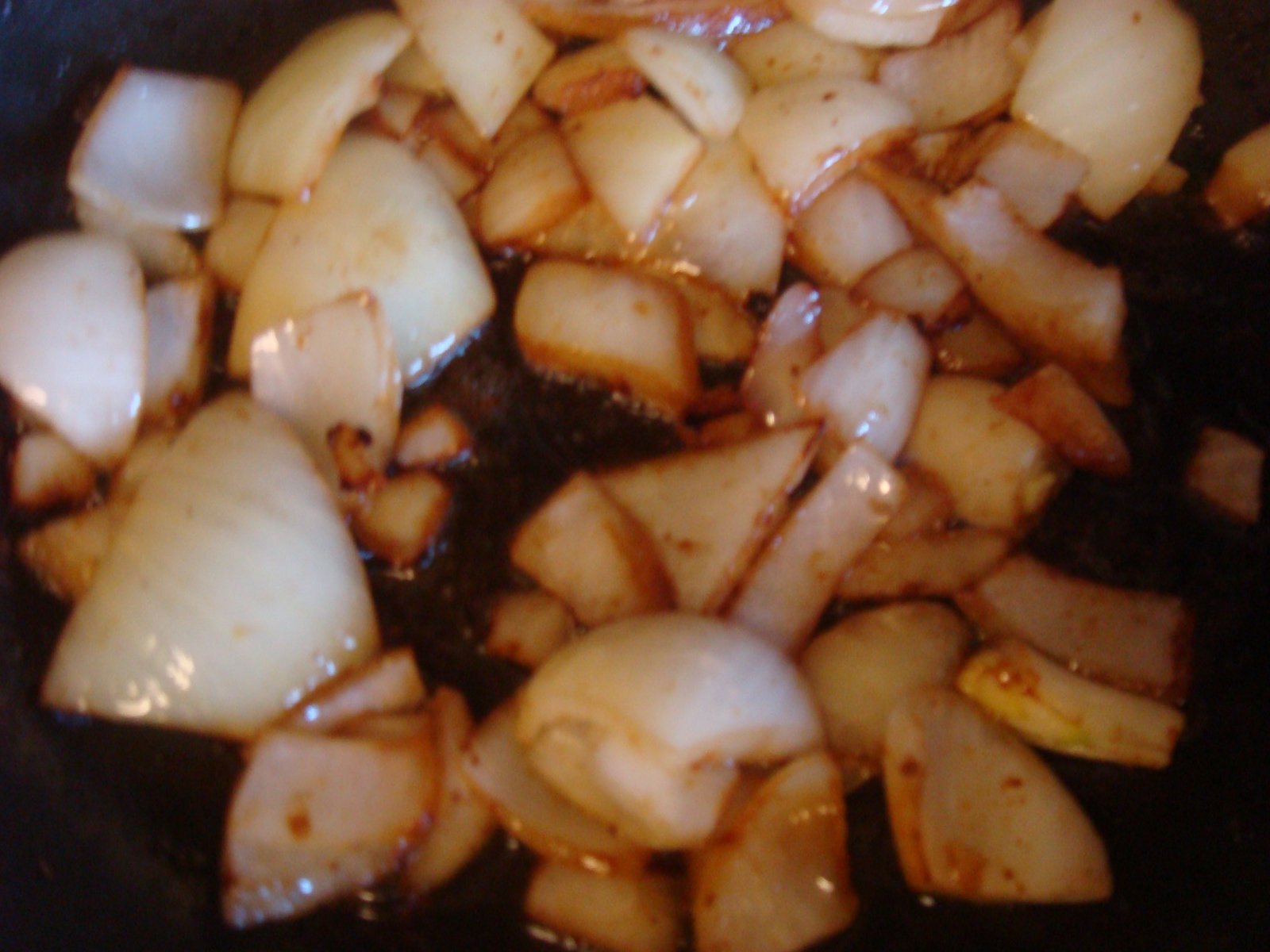 Chop the onion and put into the pan that has some butter and juice from the meat in it. I have to chop into *very* large pieces because I married someone who refuses to eat onions, picks out even the most minute specks of diced ones, yet knows when I make a dish without onions, because "it doesn't taste right". I've adapted.