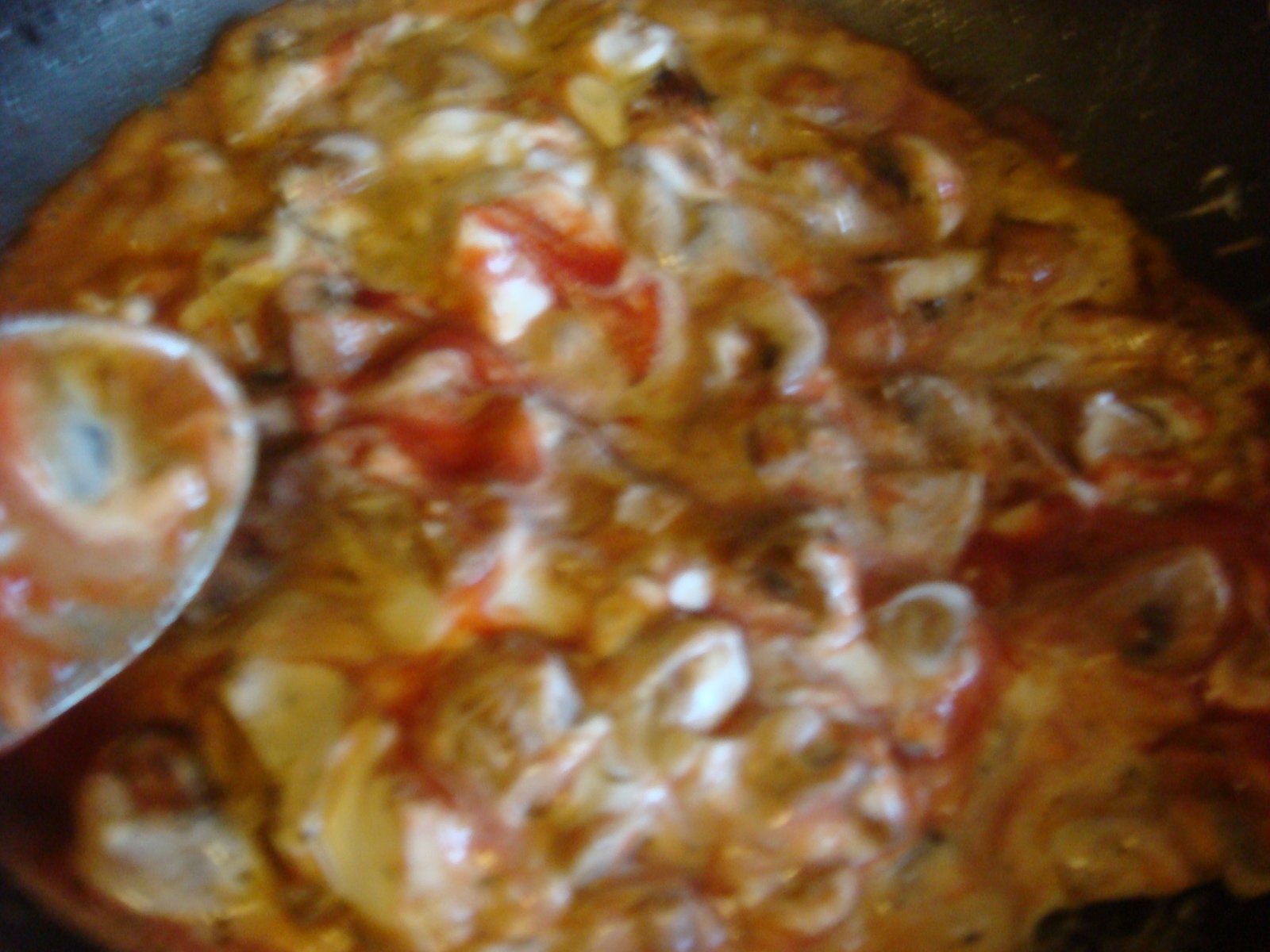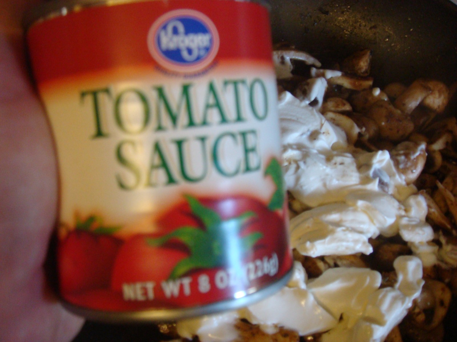 Add sour cream to mushrooms. Add tomato sauce to make sour cream thinner.