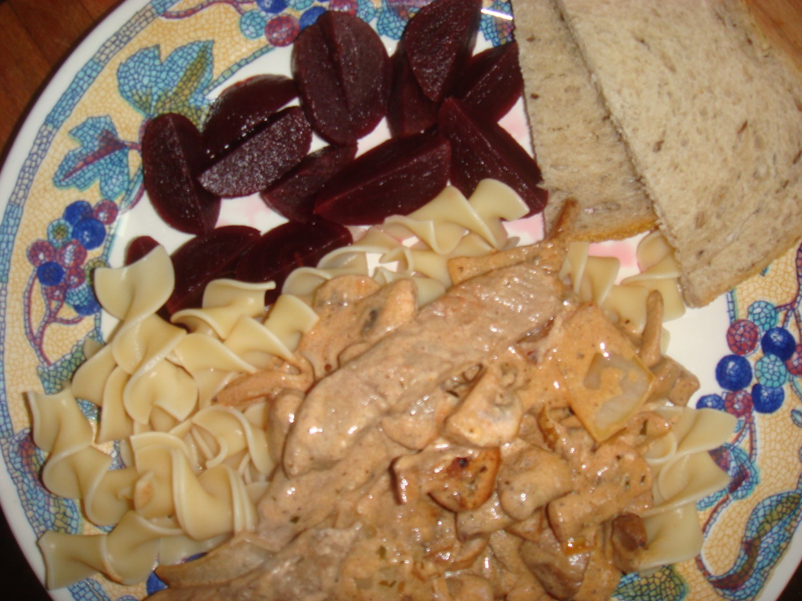 Yum! I started making stroganoff for my mom with boneless skinless chicken breast, which sounds weird, but works well. I use tomato paste instead of sauce, because chicken is juicier, I guess, so it doesn’t thin the sour cream so much it won’t coat. So, if anyone has a picky, non red meat eating family member, give it a try. (Doesn’t every family have someone who won’t eat something?)