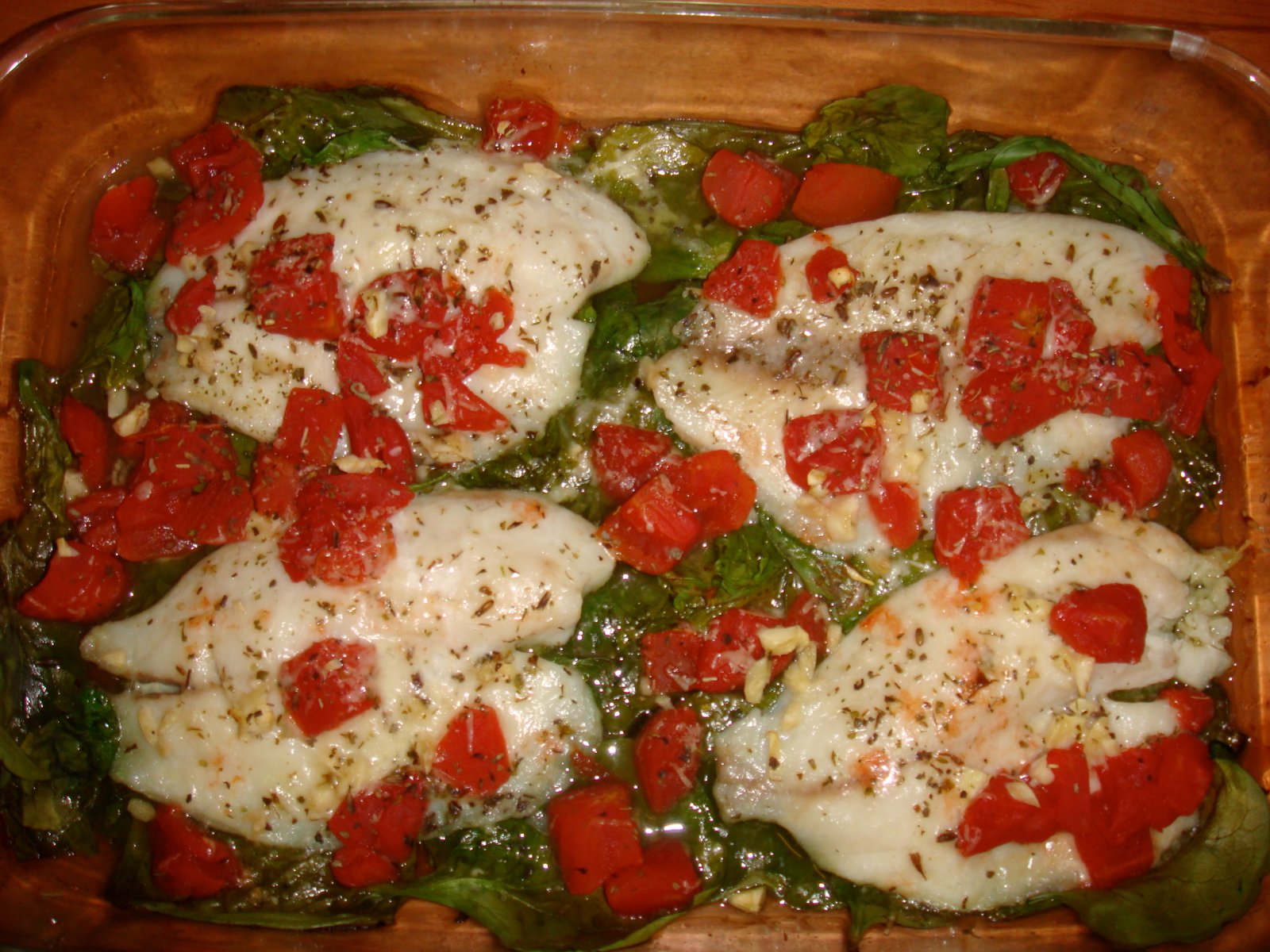 Spray casserole dish (I use a 10×10) with nonstick coating, put spinach on the bottom, top with the protein and tomatoes, cheese, garlic and some Herbes de Provence.