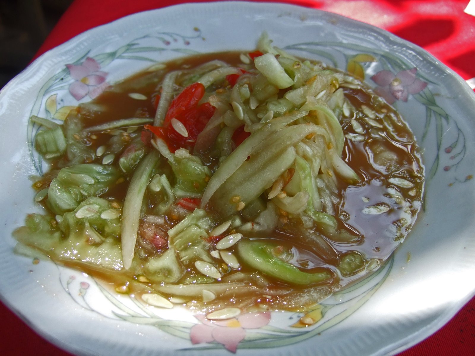 This cucumber version, of the more well known papaya salad, was nicely pungent, but the heat had been gringo-ized, and the seeds were not removed before shredding.