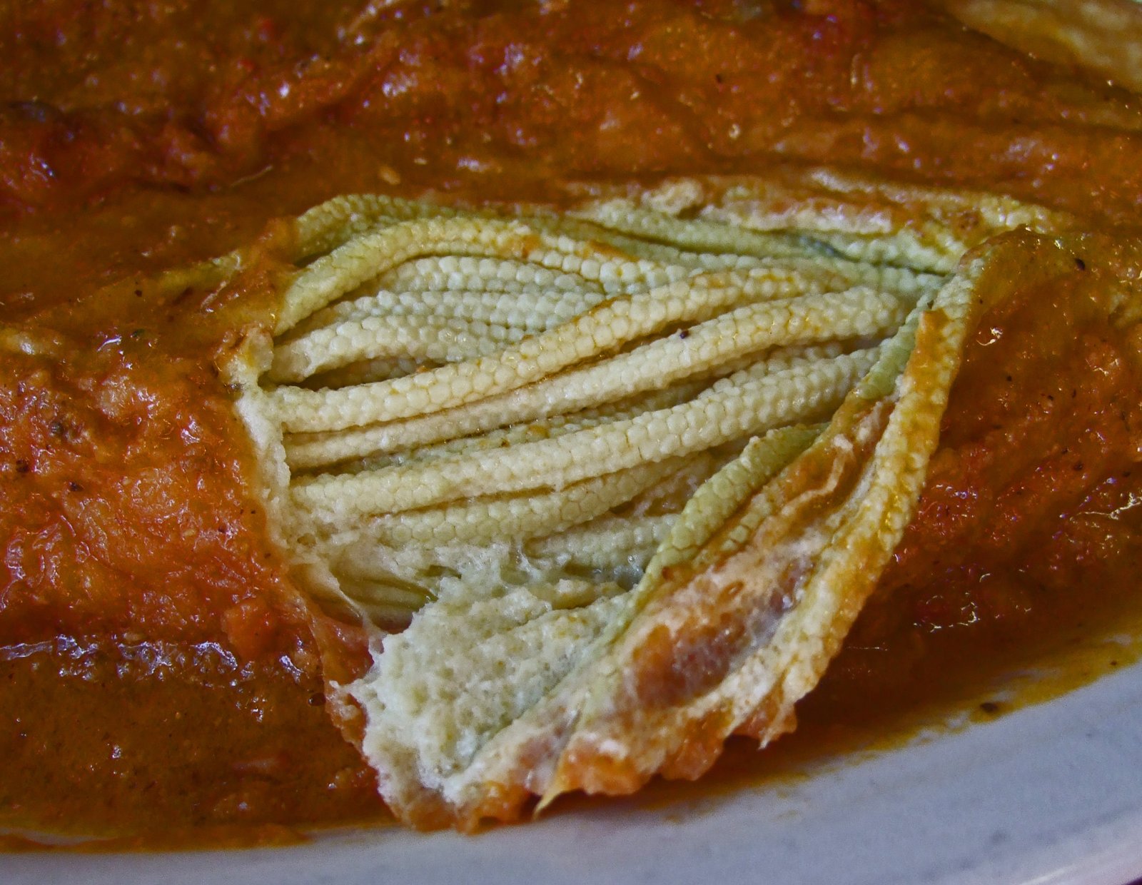 It's called Pacayas Forradas con Huevo ($7.95). Never heard of it. Doesn't look like anything particularly interesting. But brush off some of the really nice mildly sweet and rich tomato based sauce, and the egg batter, and something like this looks back out at ya'.