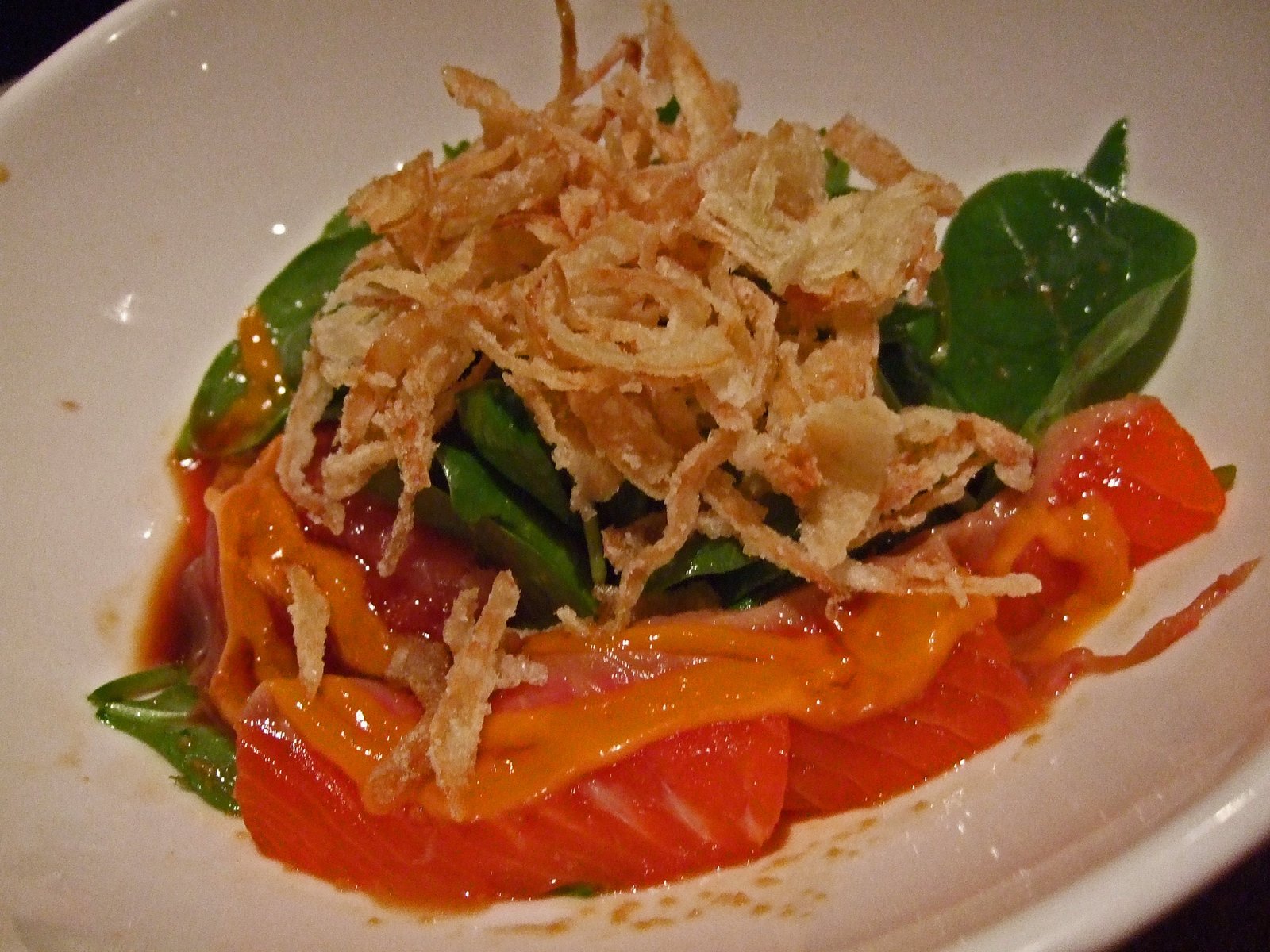 The parts of the salad were wonderful; crisp baby spinach, crisp fried potato, and wonderful salmon(though the maguro was, meh). But when put together with an overly salty ponzu like dressing and drizzled with a spicy mayo, like you'd find on a spicy tuna roll, this wasn't very pleasant. This was my least favorite dish of the night.