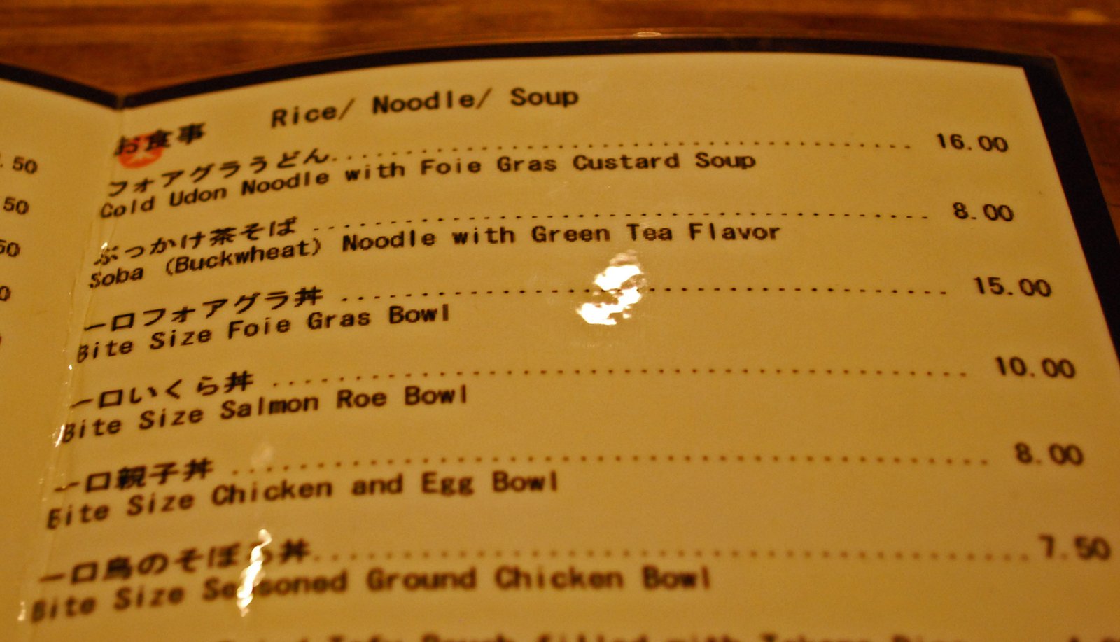 The menu is pleasingly large, with a variety of dishes. In addition to the grilled items, there's a section of items in broth (Oden), and one of starches….but oh, what starches they were. In addition to the typical yaki-onigiri (grilled rice balls), there were some really interesting items.