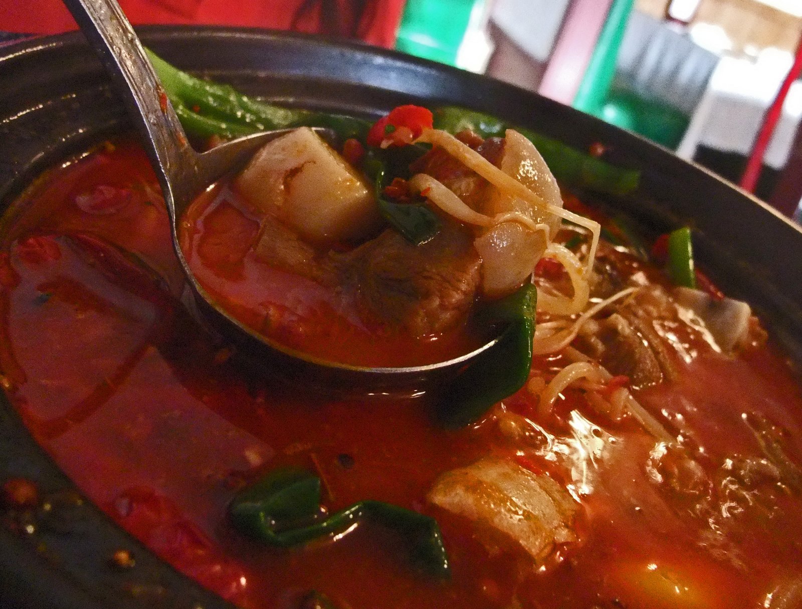 Within the writhing red liquid were large pieces of lamb(the braising portions), bean sprouts, shiitake mushrooms, and other stuff.