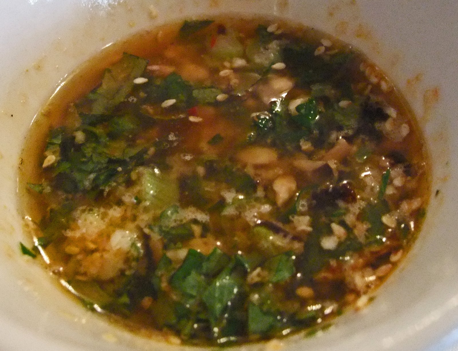 A dipping sauce of minced garlic, sesame oil, and scallions was also provided. The drill was that you'd add a spoonful of the hot pot broth to the bowl, and utilize that as a dipping sauce.