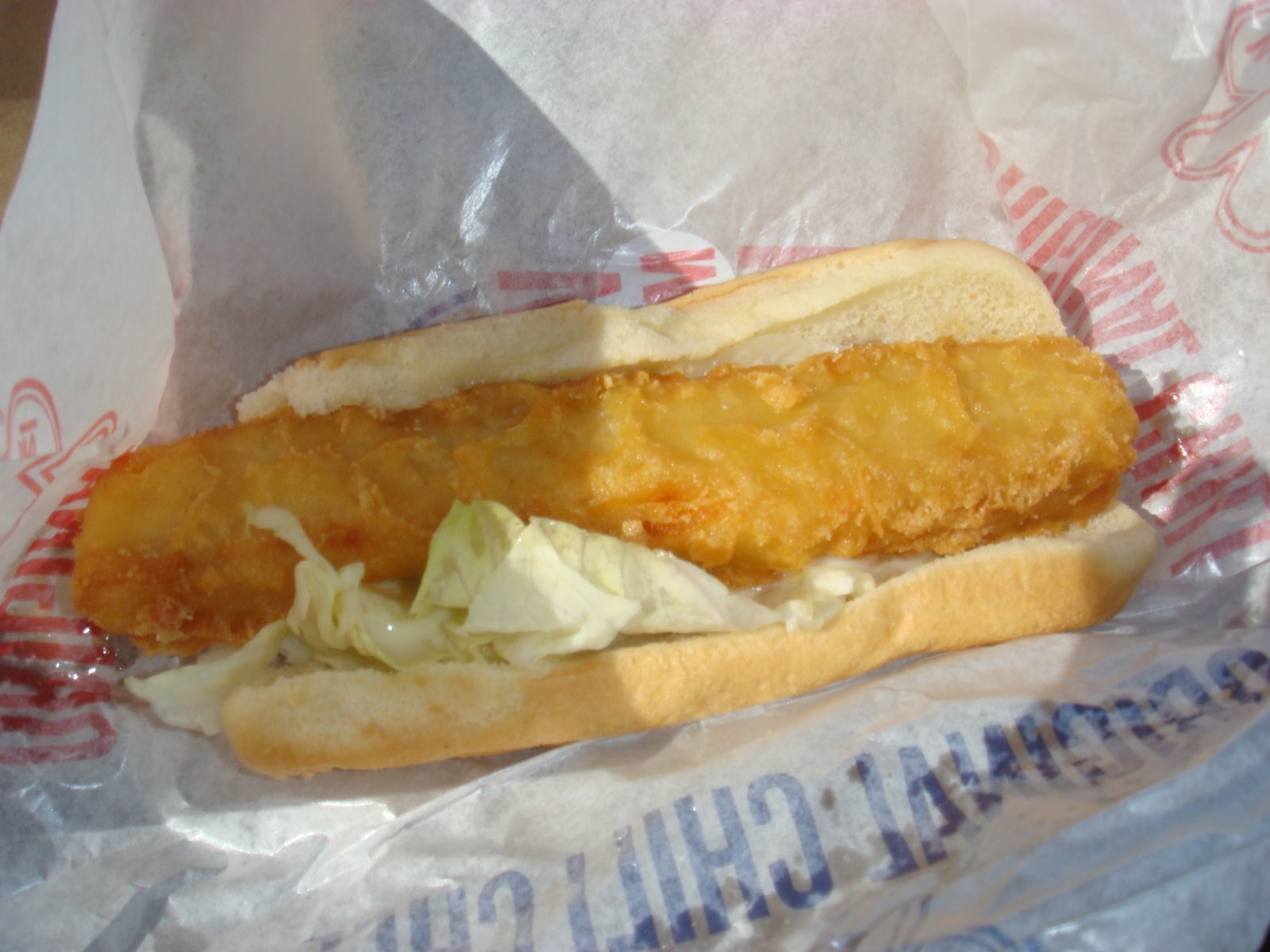 Basically a fish stick on a hot dog bun, with lettuce and tartar sauce.  Less than $2.