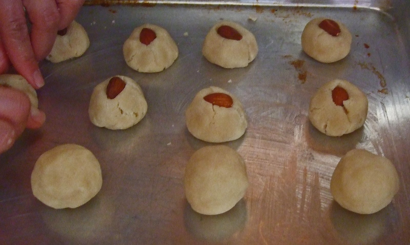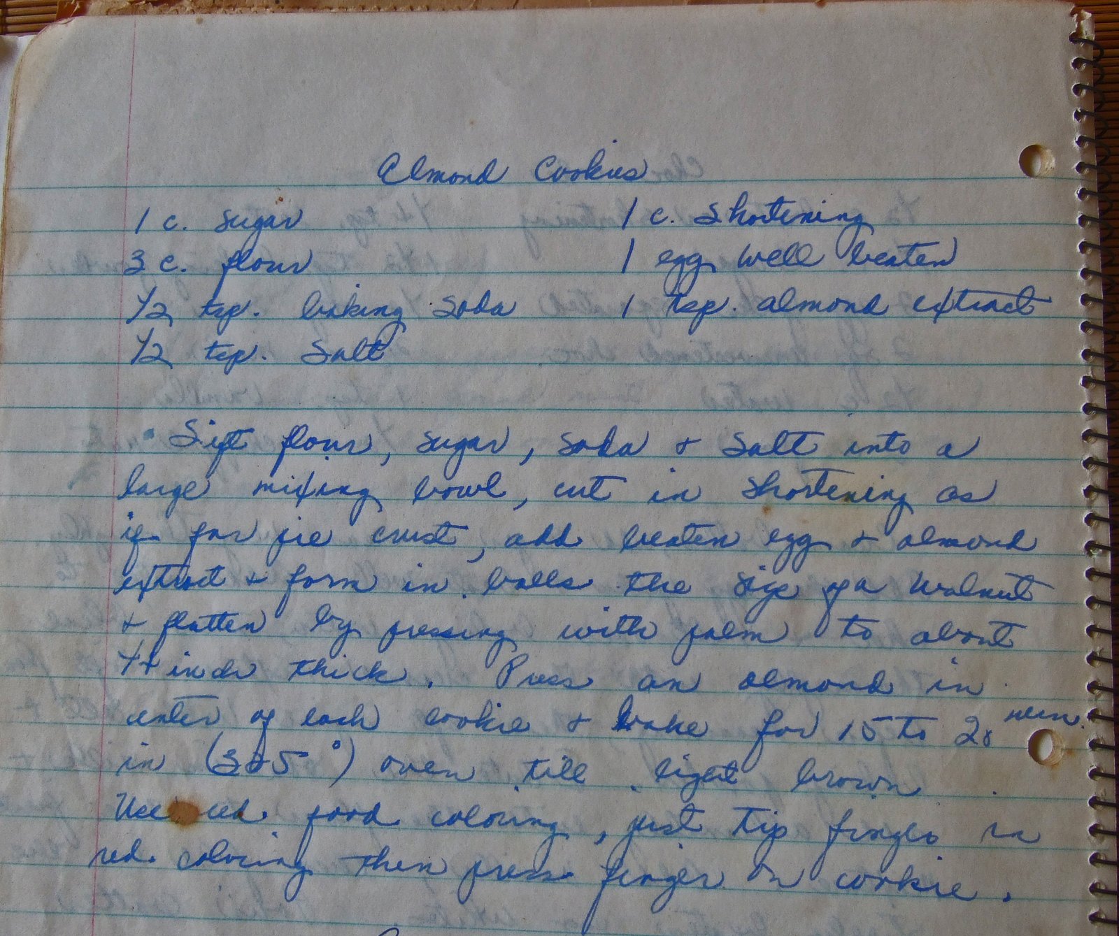 A few weeks ago, I was organizing my huge mess of a cookbook collection, when this popped up. I've written about this very special spiral notebook before. I found it after my mom passed on in 1996. It's one of the very few things I have from my mother…..the two cases of MD toilet tissue she had hoarded away in her small closet is long gone. The notebook fell on the floor, and opened up to the page with an almond cookie recipe. As a child, I could never help myself when faced with the inevitable jar of almond cookies at the cashier counter of a Chinese Restaurant, or at the register at "Lau's Market", the small store on the corner of 8th Avenue and Waialae. A wave of nostalgia rolled over me……