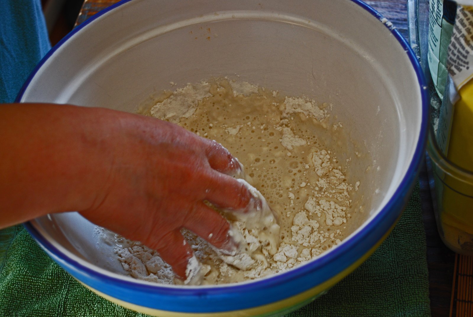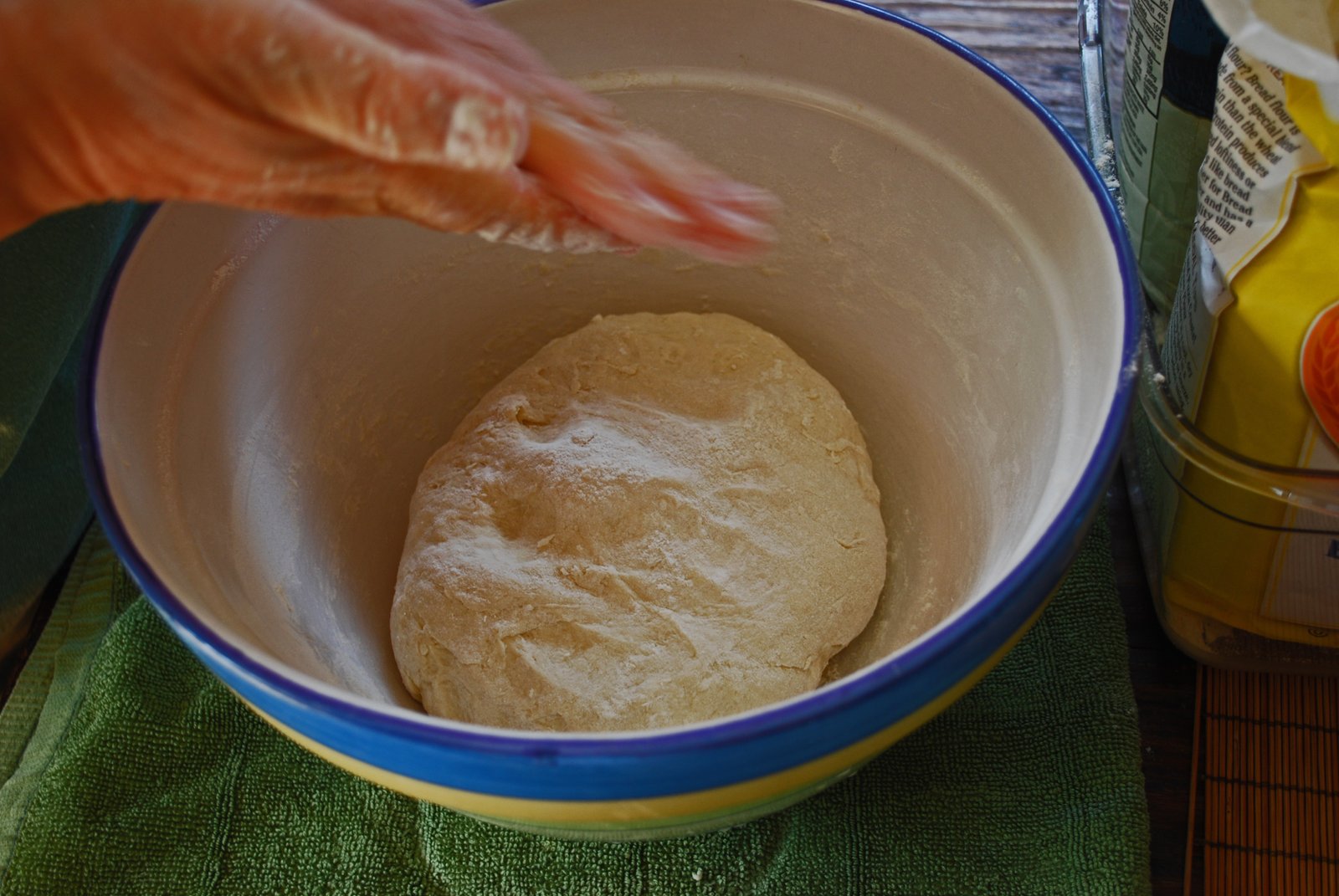 After achieving the correct texture, she covers the bowl, and lets the dough rest in a mildly warm area for 15-20 minutes.