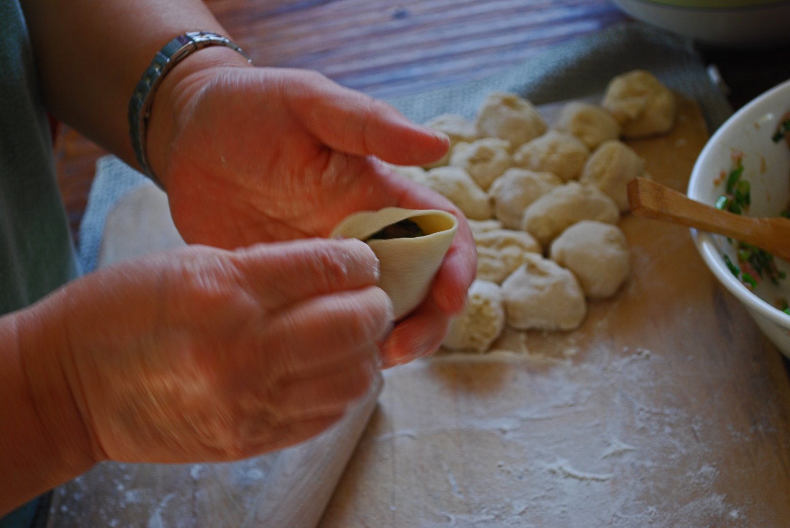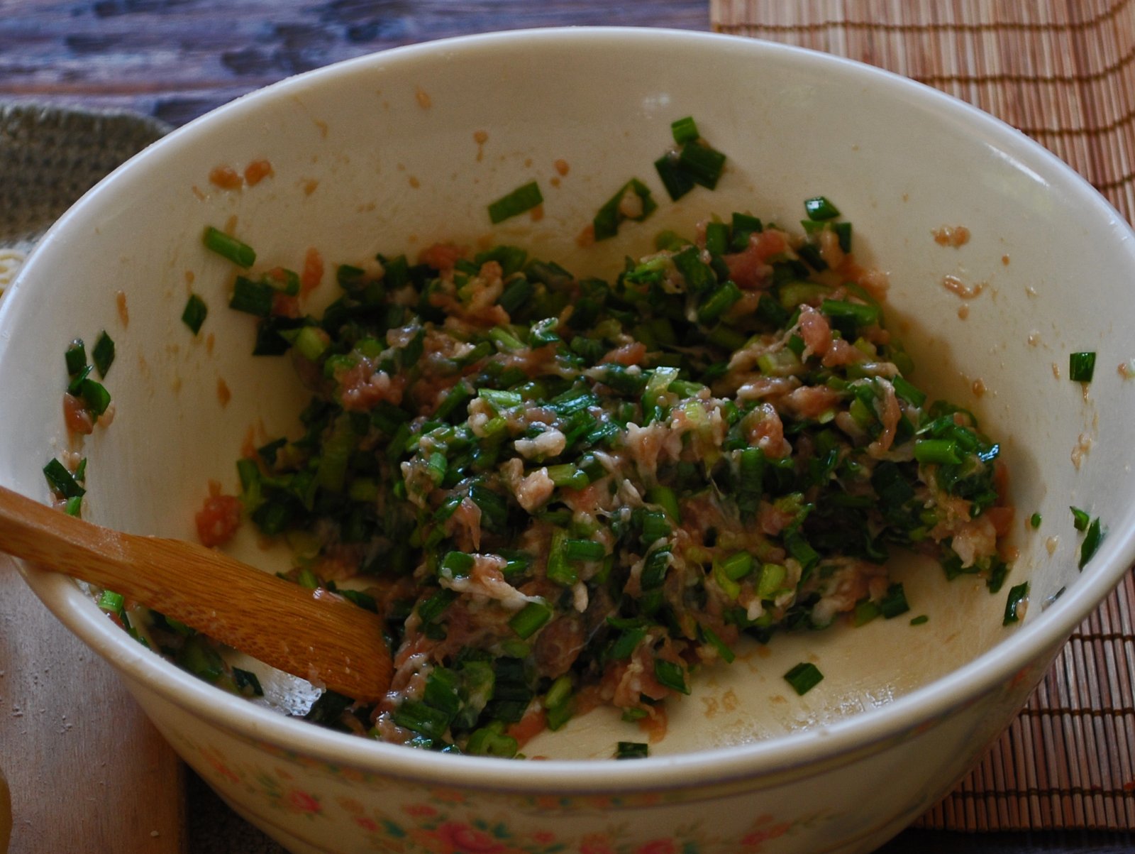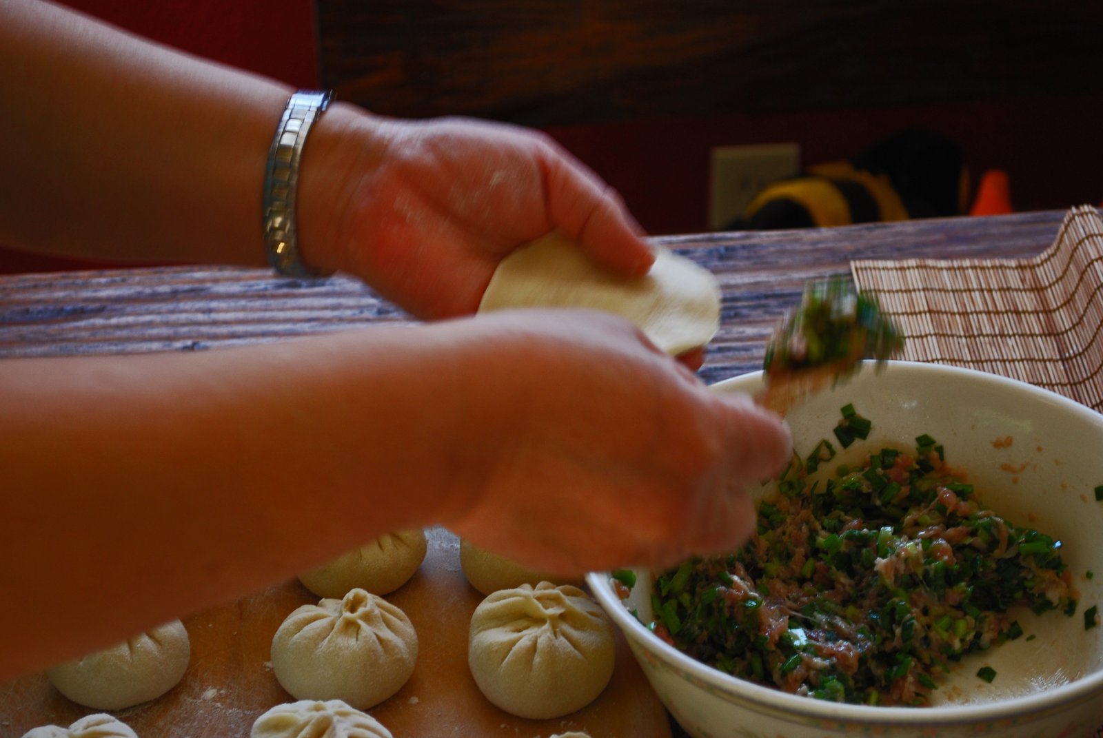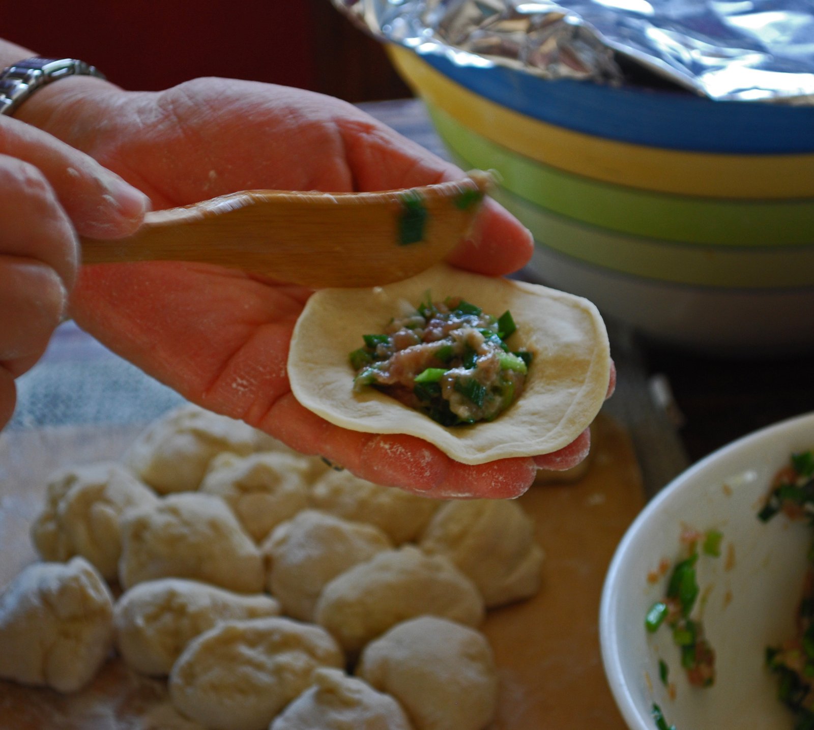 On this occasion my MIL made two different fillings, a pork with chive and scallion, and a chicken filling. Of course, I enjoyed the pork much more. I'm thinking that next time, adding a bit of pork aspic to the filling (a la XLB), will make these even juicier.