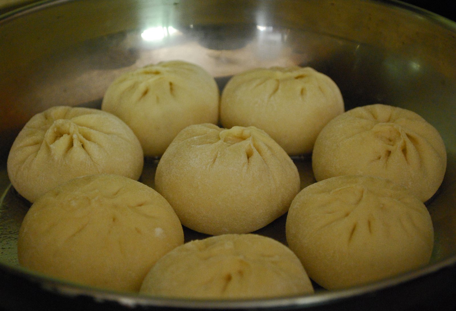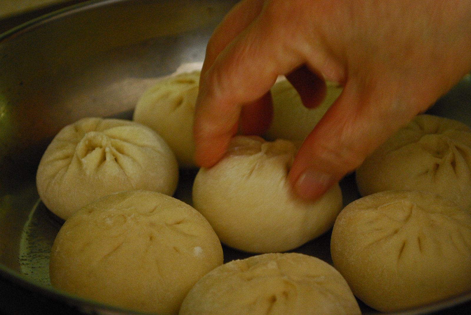 To get the Bao steamed, pour about one-third of a cup of water around the rim of the pan. Do not pour on top of the Bao, as this will ruin the texture. Cover immediately(watch out for the splatter) and let steam until water has evaporated. Add another one-third cup of water in the same manner, and cover. From what I've read, you can make this a slurry with some cornstarch if you want the Bao to stick together. Once water has almost evaporated, you can check to see if the SJB is ready. Gently touch the SJB; if the dough springs back into shape, the SJB are ready. Also, check the bottoms of SJB to make sure you've attained the desired crispness.