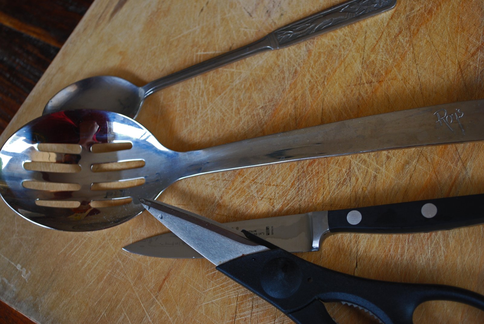 After completing all of my chores, I finally set out to work on my urchin. I have had more than my share of uni, but I had never cracked a large one myself. Back home in Hawaii, I've eaten smaller seas urchin (called `ina ), but had not really eaten the bigger "wana" (vana). After watching Rosemary, I was sure that I could do at least, a third rate job. Rosemary worked with a small slotted spoon and a pair of kitchen shears. Unlike what one of my friends say….you don't need a "special tool" to remove the gonads from the urchins. Though I wish I had a small slotted spoon…..