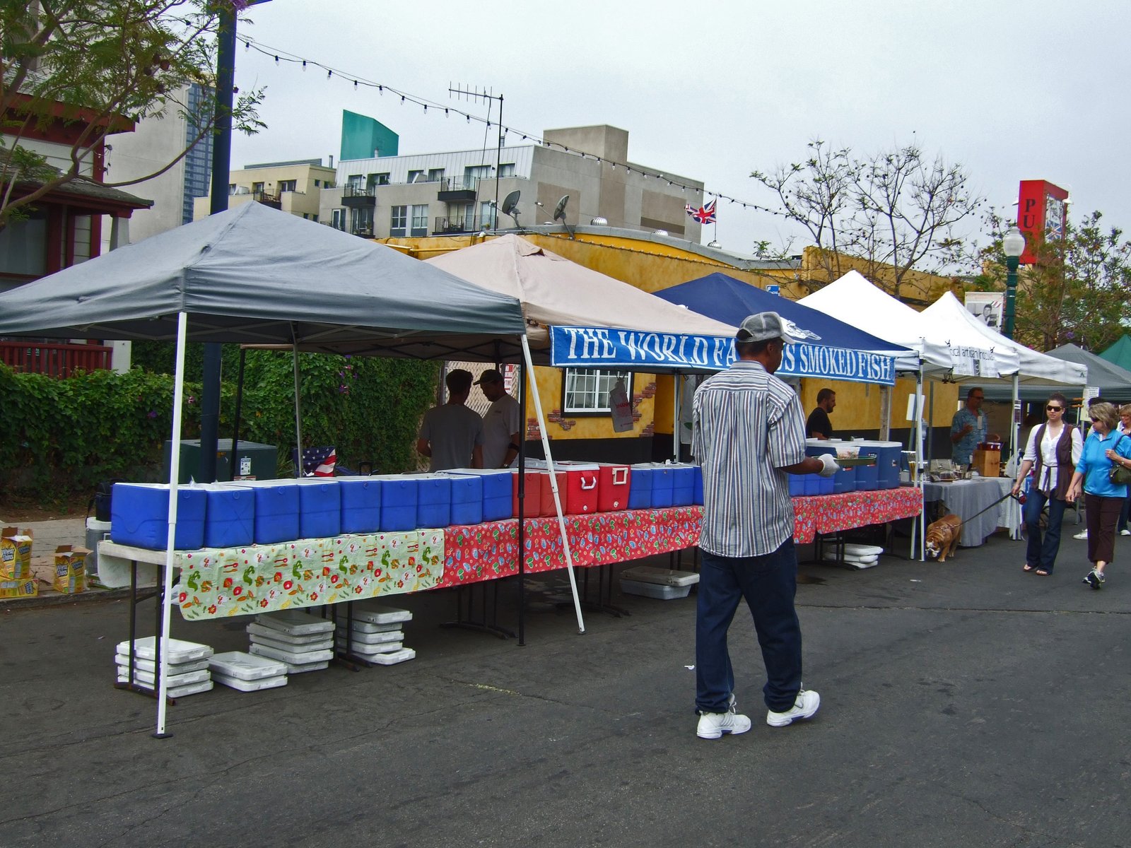 So this morning I headed over to Little Italy, found parking with no problem, and walked a block over to the Mercato. Traffic, both the four wheeled and two legged kind was very light, and right at the South end of the Market, I saw the booth for San Diego Kelpbed Products.