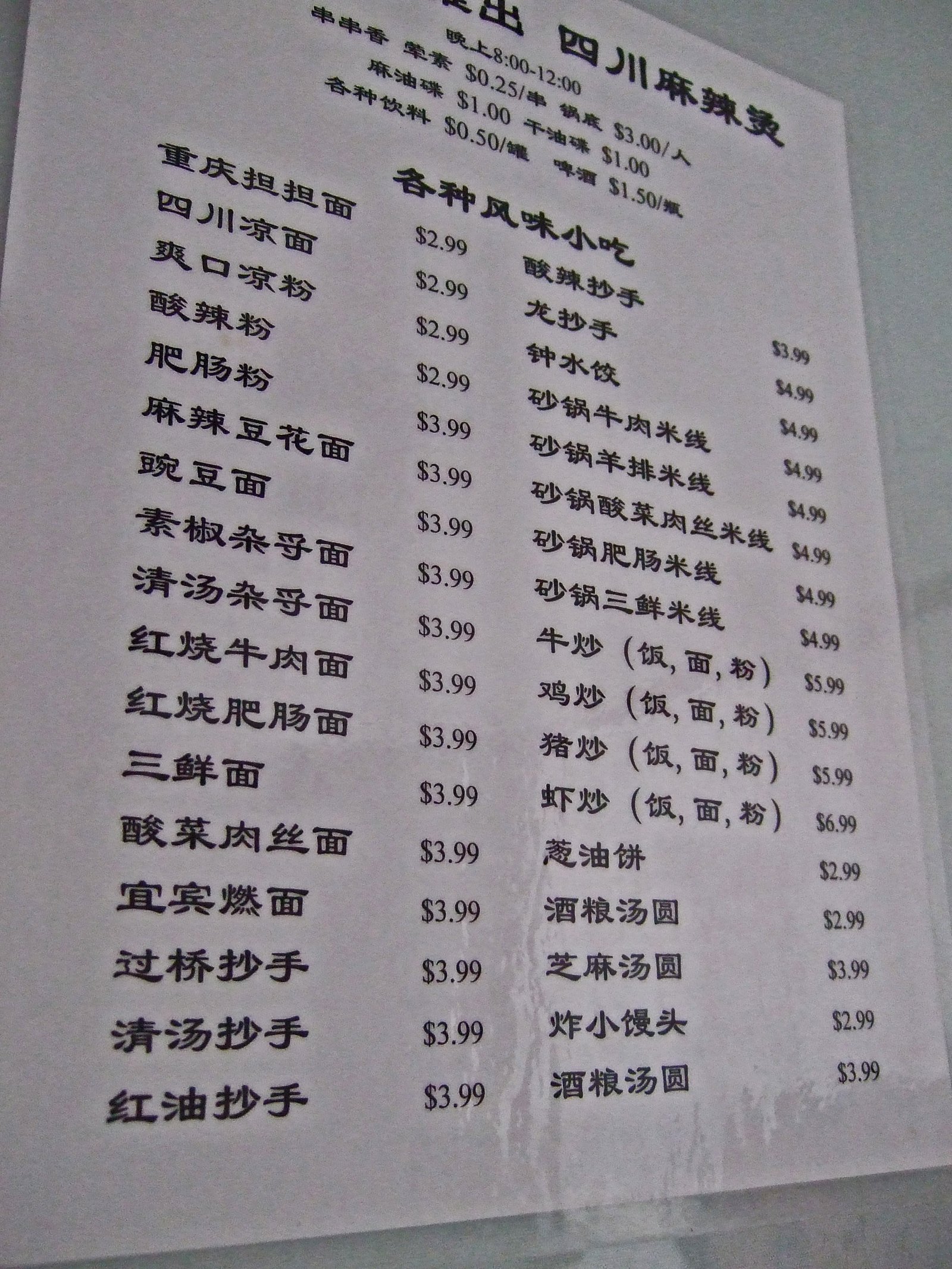 This latest special features ordering a "ma-la" base, which comes in three heat levels, the "spicy" is a bit thicker, spicier, and more vicious than Ba Ren's Huo Guo. Once you order this, you can than choose some noodles and snacks off the special menu for between $2.99 – $4.99. Tsingtao Beer is $1.50 a bottle, soda is 50 cents. You can only take advantage of this menu by ordering the hot pot.