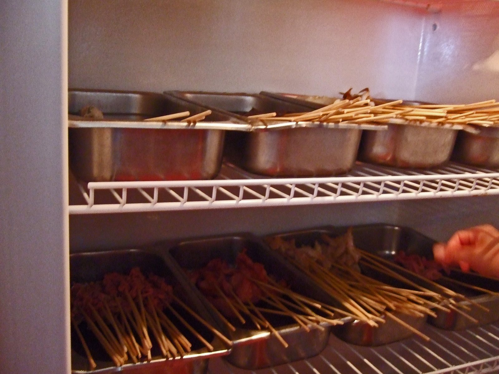 The best, and most fun part is that after getting your hot pot($3/per person), you're given a basket, and access to the large refrigerator, and pick out skewers at your choosing. Each skewer is 25 cents a piece, you also grab your own soda and beer. At the end of the evening, they count your bottles, cans, and skewers, add your noodles, and tally your bill.
