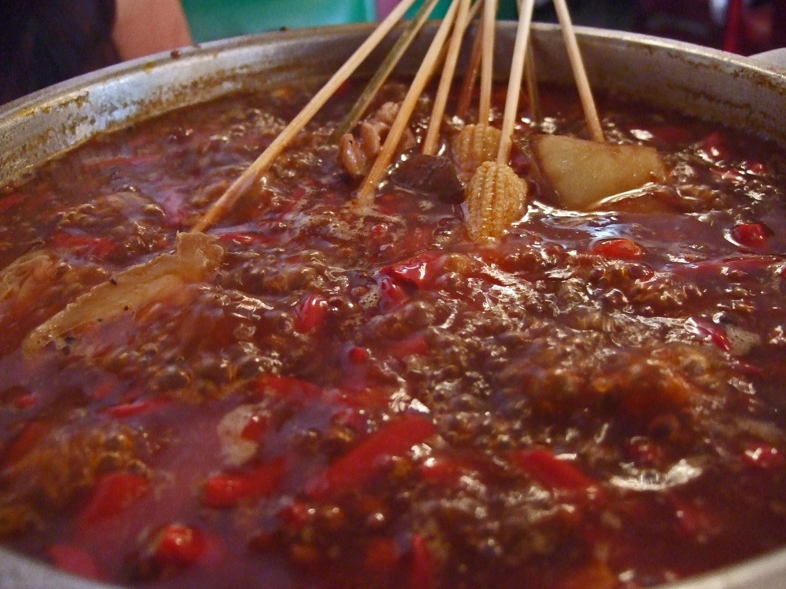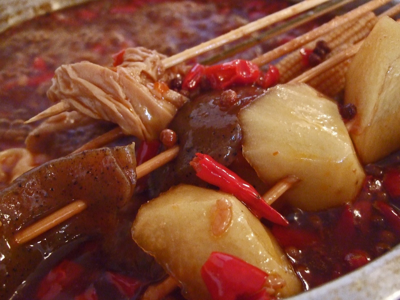 Our favorites were the beef, intestine, quail egg, mushroom, and potato. We ordered 3 noodle bowls, which are about two-third of the usual portion, and some Crossing the Bridge Won Tons. We ended up taking two of the noodle dishes home, since we ended up eating forty five skewers! When I asked "Roy" how we did, he said, "this is about average, and big eater will eat forty, fifty skewers. In Qingdao, I personally eat over fifty skewers, some noodles, and a few beers." Yikes! So you can eat your noodles while waiting for your skewers to cook in the hot pot.