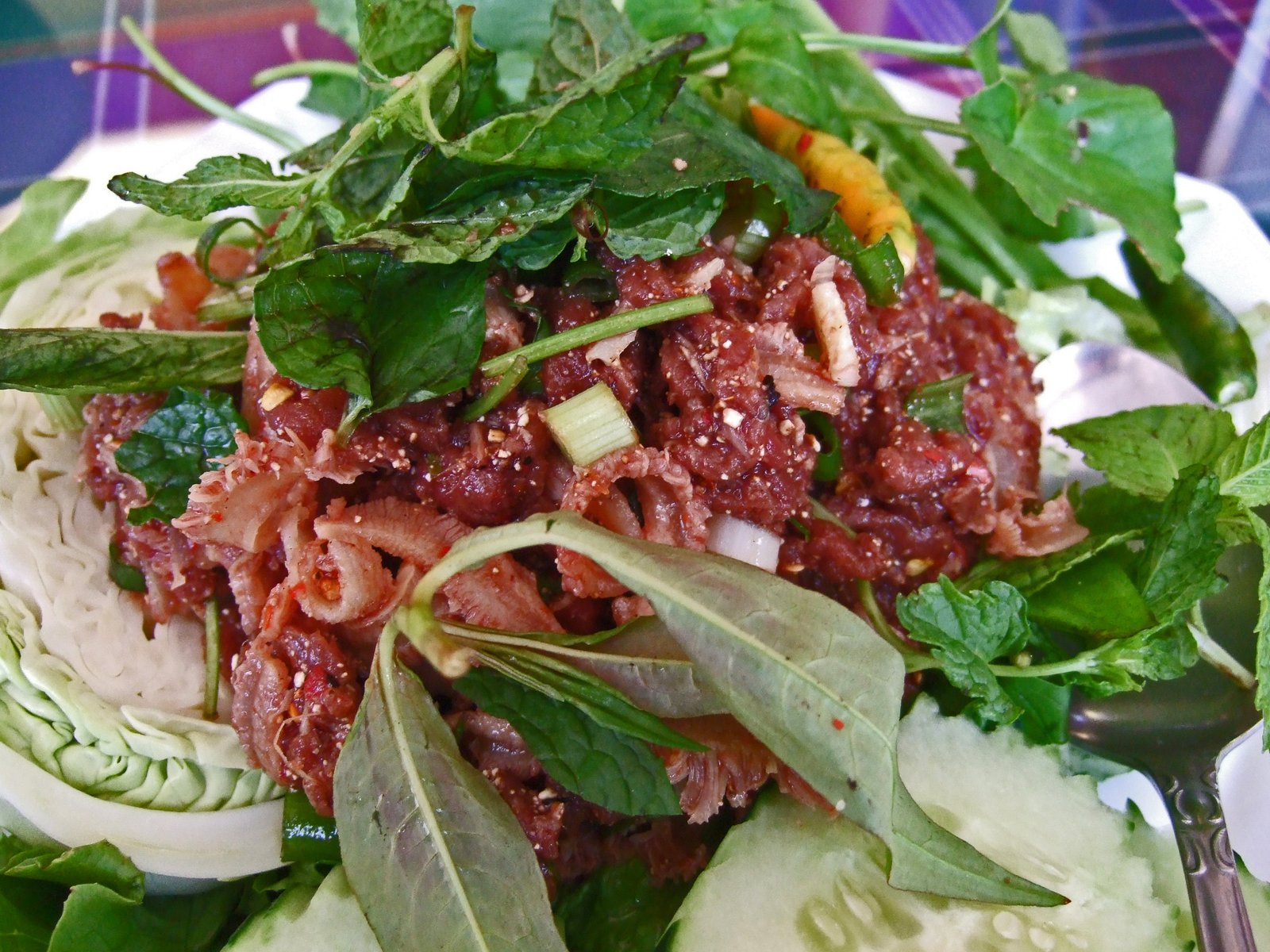 The menu at this new location, looks the same, though I decided to stray a bit, and started asking about a few items. I think it's unfortunate that dishes like Or Lam, Mok Pa, and Kaeng Nor Mai Som aren't represented on the menu. In speaking to one of the young men, I was told that items such as those would not sell, though they make them for their own family meals at home. There are a few items that aren't on the menu, one which is the Raw Beef Larb: