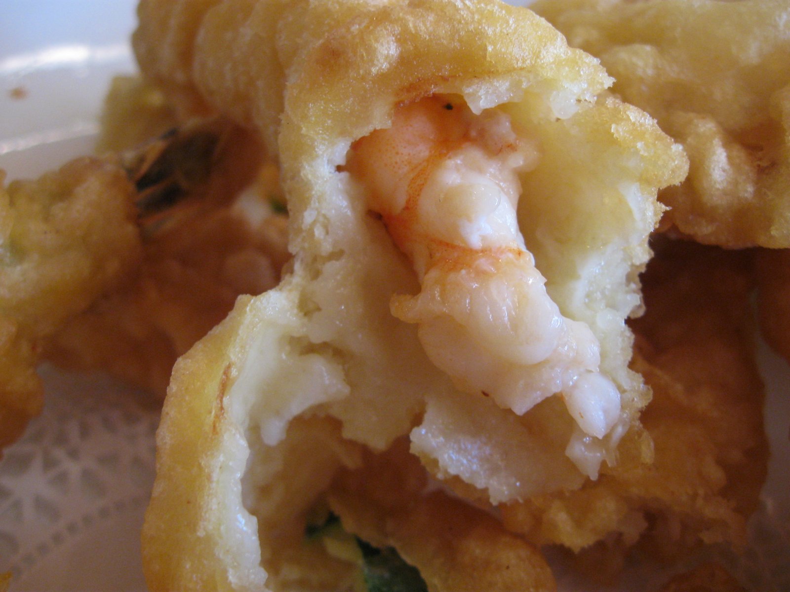 After wiping the grease off my fingers, I attacked one of the large shrimp, biting off the end. But there was no shrimp there. The last half-inch of the shrimp shaped thing I had put in my mouth was simply breading. After I peeled off the dense exterior, my large shrimp turned into something slightly smaller than my little finger, a truly shrimpy shrimp: It was also desiccated and flavorless. Yuck!