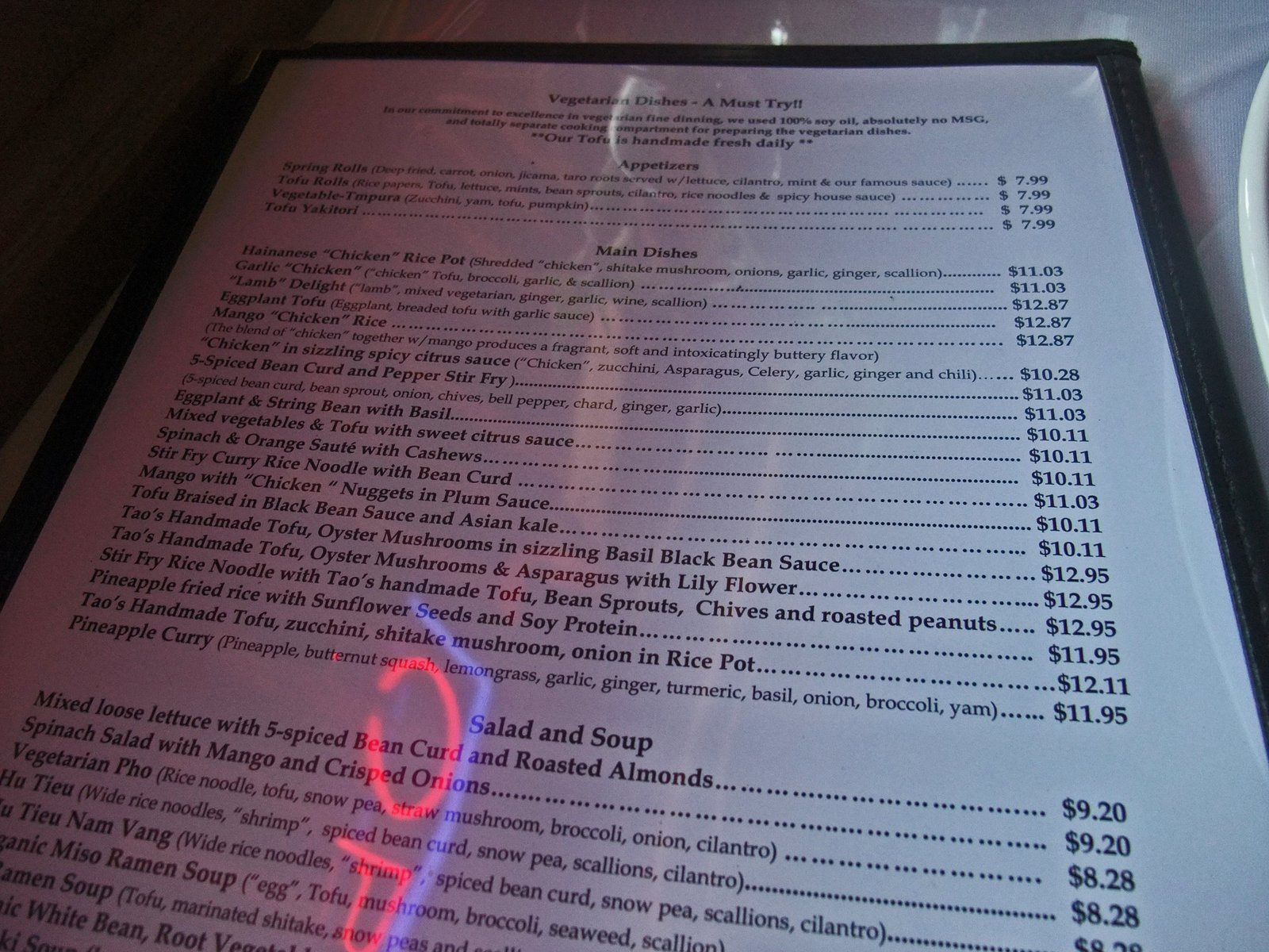 4. Thanks for the review. After we read your review, my family and I went to eat at Tao on Adams Ave. It was unbelievable!! I went there with my mother, sister and my 2 kids. We absolutely love the food!!! I love the handmade tofu it was out of this world. It was full of flavors. Perfect for my mom who is a picky vegetarian. My kids ordered the odon soups and it tastes better than the expensive 5 stars hotel (Grand Hyatt)odon which costs more than $18 per bowl. The service is very good. Our glasses are always full of water.