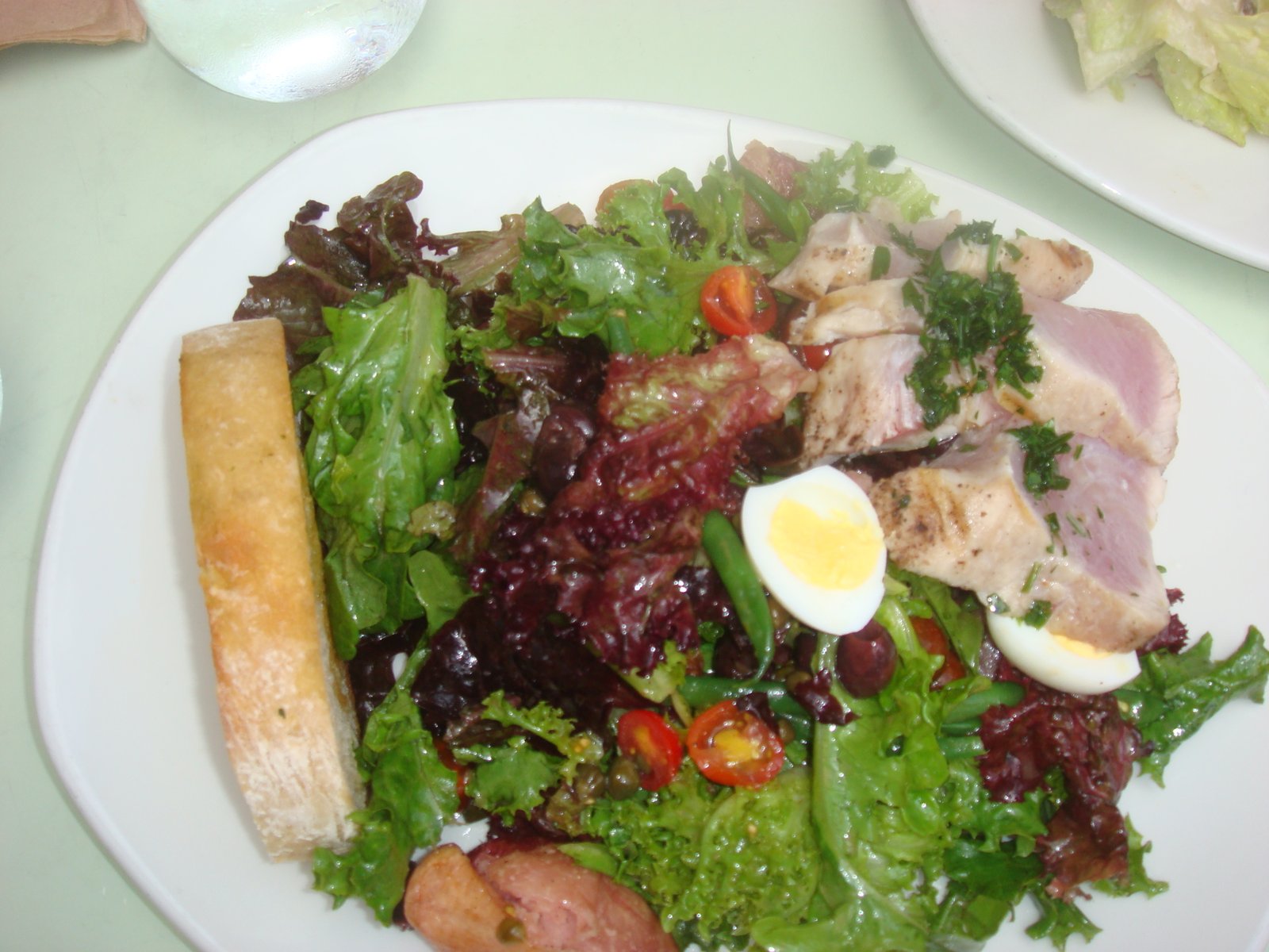 The Nicoise Tuna Salad ($10) is plentiful, with green beans, olives, capers, potato, tomatoes and the teensy egg you see there, topped with a sherry vinaigarette. The tuna is cooked rare and is tender and very, very good, the topping on the tuna is light and parsley-oil based.