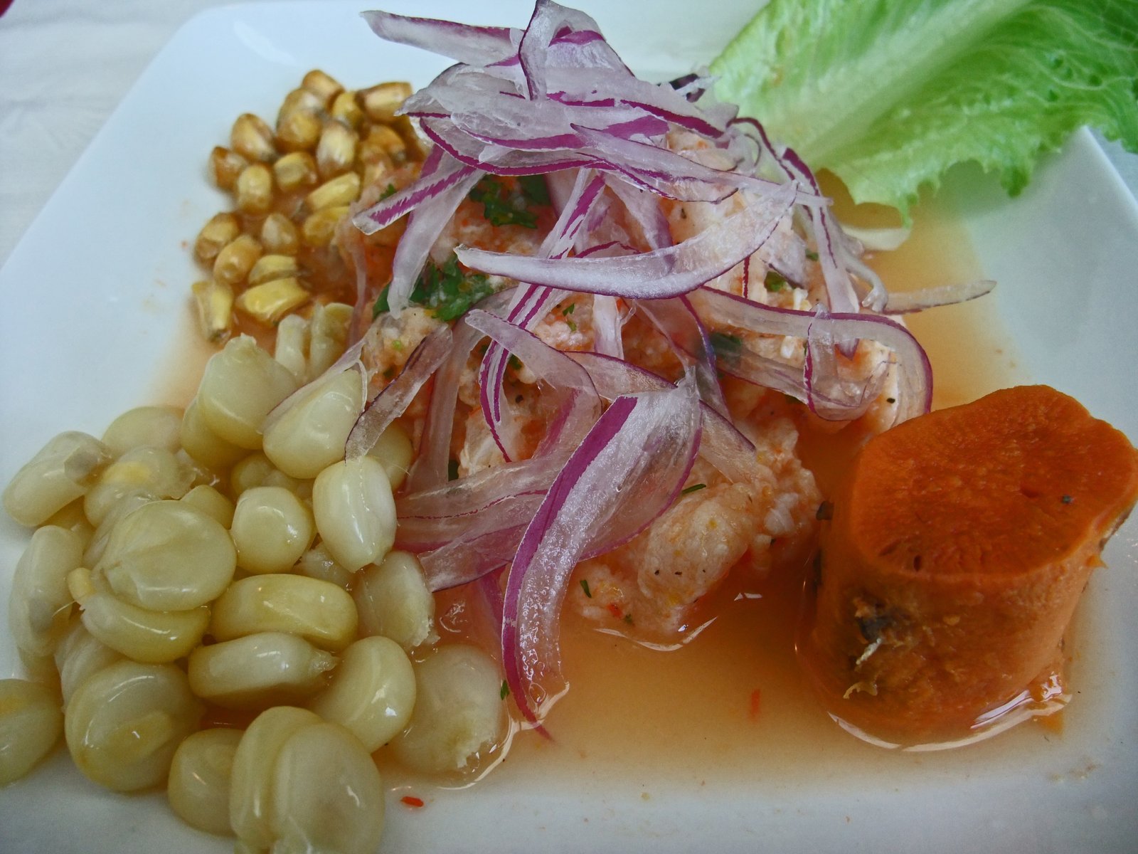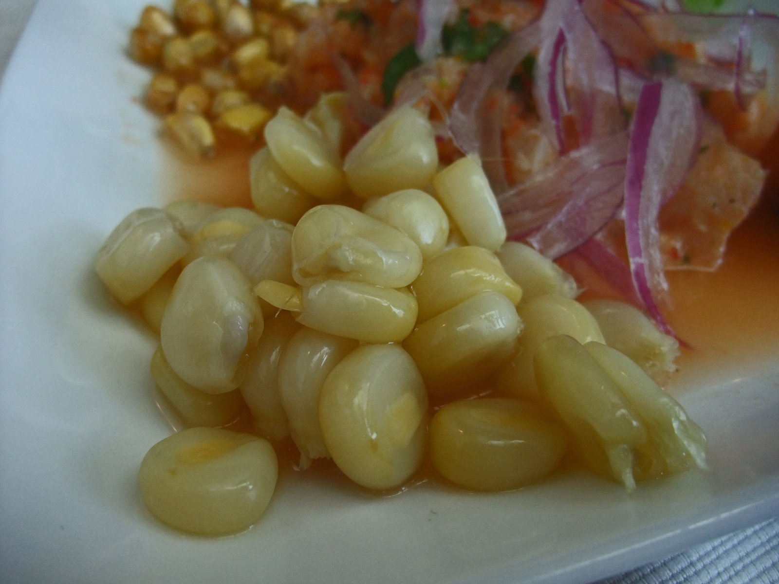The cancha (fried corn kernals) and choclo (peruvian corn) were perfect and spot on. We really would have preferred a proper Camote (sweet potato) prepared in the Peruvian way, or even some purple sweet potatoes. The fish looked, tasted, and had the mouth feel of what they call "Corvina" in Peru(white sea bass), and was prepared well, with just the right amount of "cooking" from the citrus. It was however, a bit weak in the flavor department, you could say that the "Leche de Tigre" ("Tiger's milk" – the marinade for the Cebiche) lacked claws. It was very bland, which made this much less satisfying than the version at Latin Chef.
