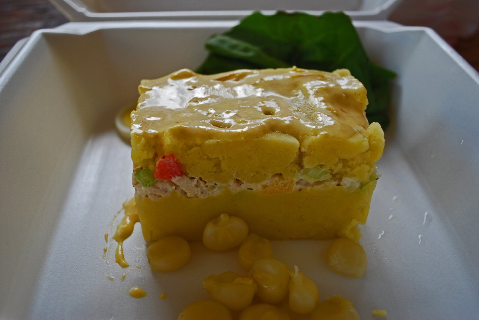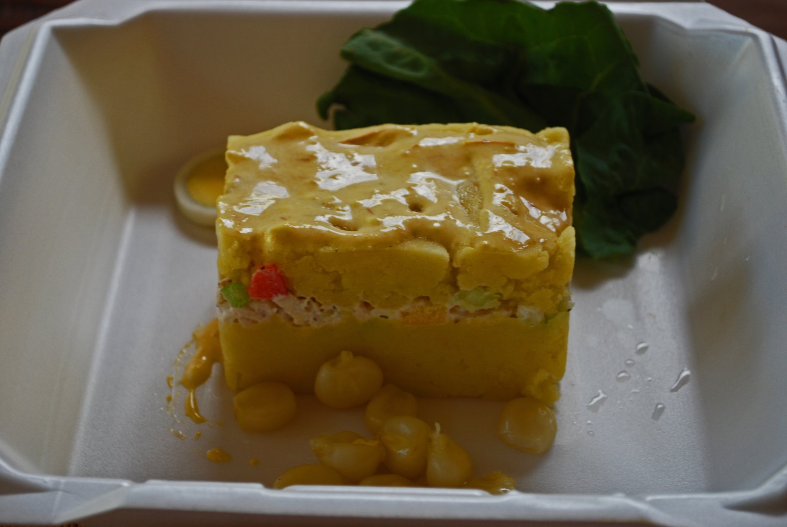 I often call Causa a "layered mashed potato cake". A layer of mashed potato is covered with a filling, the usual is a tuna-mayo filling, with another layer of mashed potatoes on the top. This was the chicken version, which was pretty good. The shredded chicken was not dressed with too much mayo, so you could still taste the chicken. And who doesn't love mashed potatoes…in cake form. It was topped with a Huacaina sauce, a mild cheese sauce, which added, but didn't subtract from the flavor. Potatoes in Peru have amazing flavor, so I didn't even try to add that to the equation. Looking at my photo, I guess you could always say that this is a mashed potato-chicken salad sandwich, with the mashed potato being the "bread". We enjoyed this.