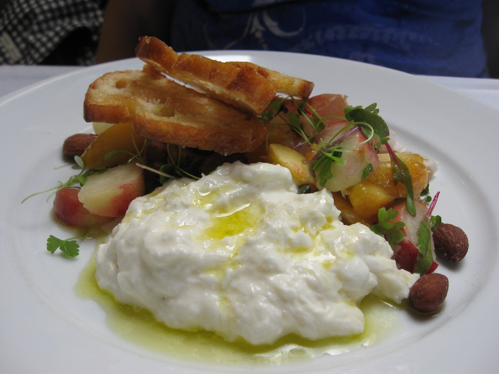 On the other side of her appetizer plate lay paperthin slices of salty old school prosciutto: Her appetizer touched all the bases. Creamy soft and crunchy. Sweet and salty. Rich and fruity.