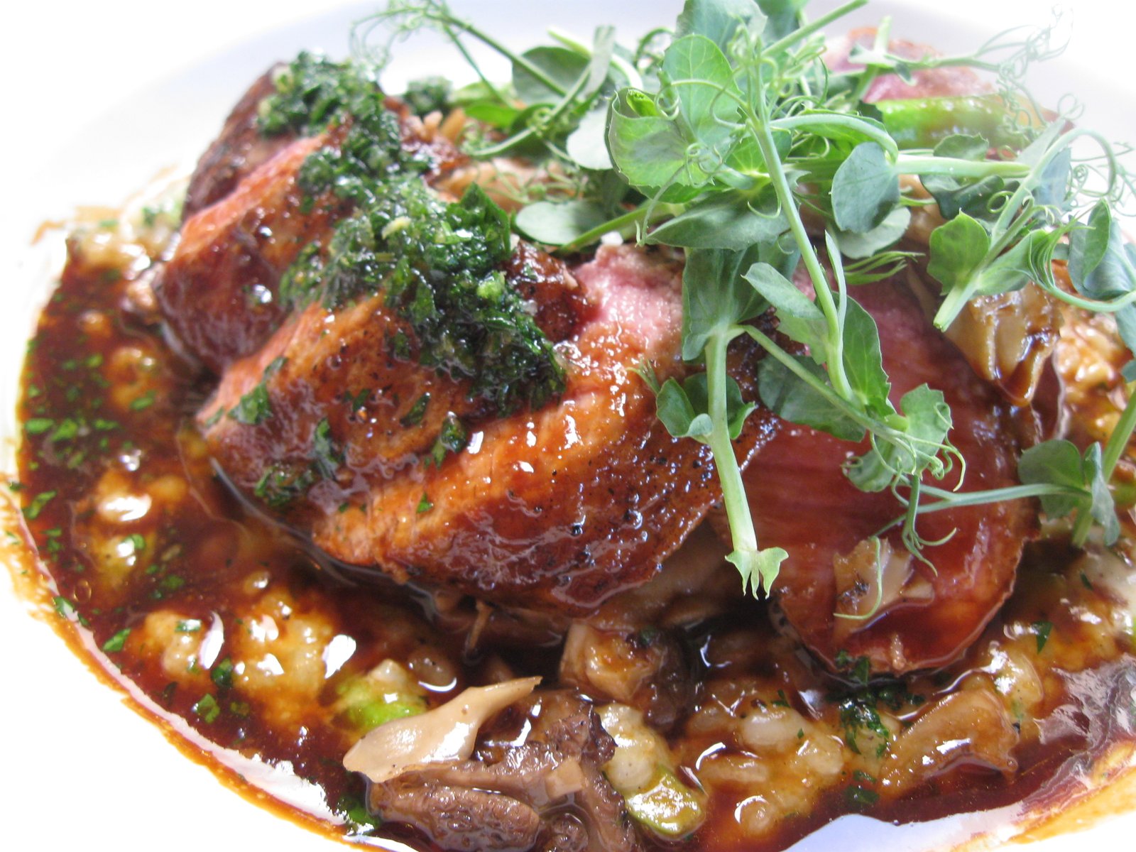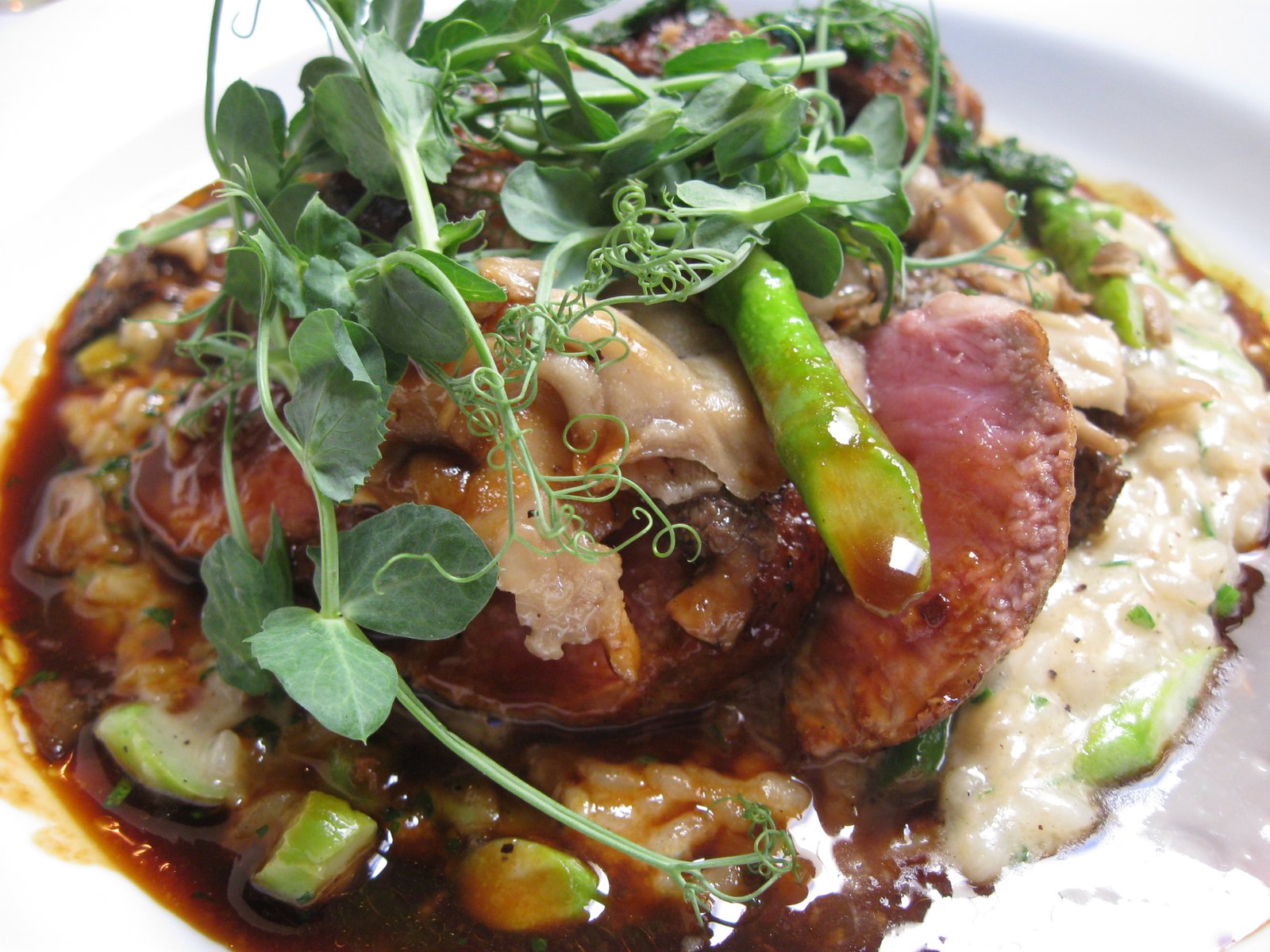 This was a pasture raised veal striploin lying on a bed of creamy rich asparagus risotto, topped with asparagus spears, hen of the woods mushrooms, Madeira sauce, gremolata (garlic/parsley oil), and pea shoots ($28) . This tasted so wonderful, that it deserves a second photo: