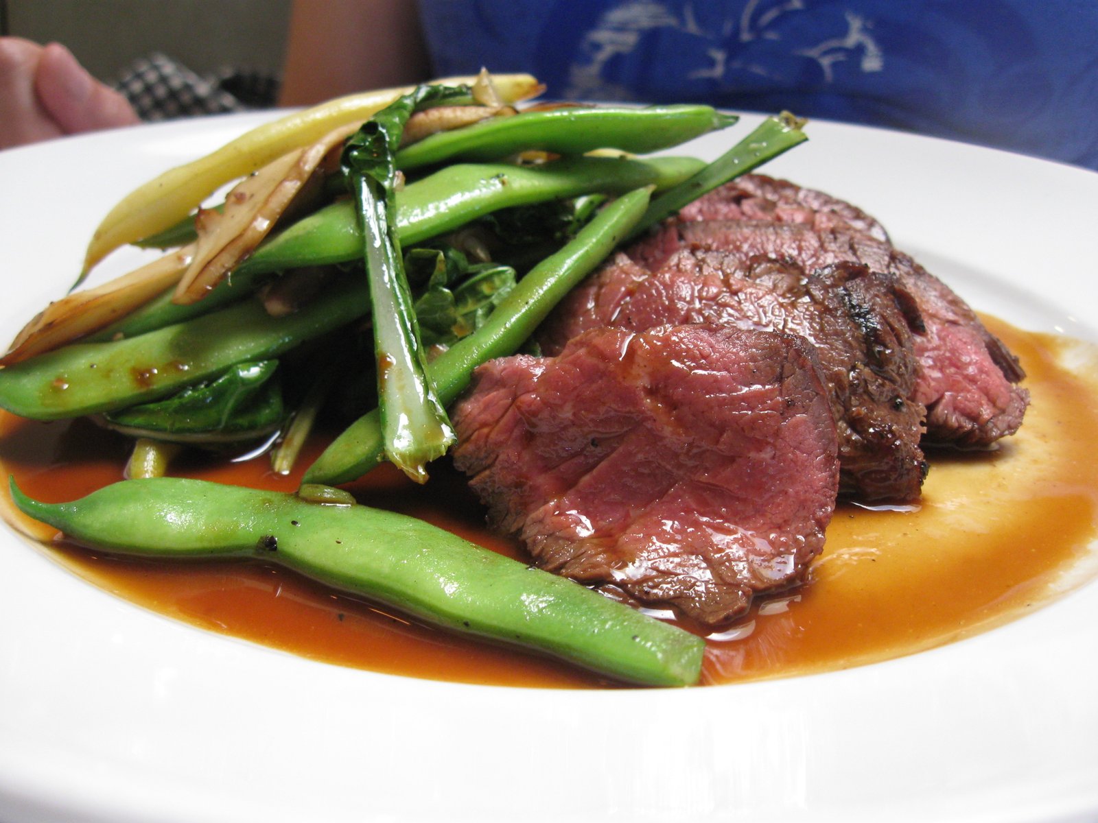 The main attraction on her plate, however, was the sliced Niman Ranch hanger steak ($26), cooked perfectly — seared but left rare in the center: