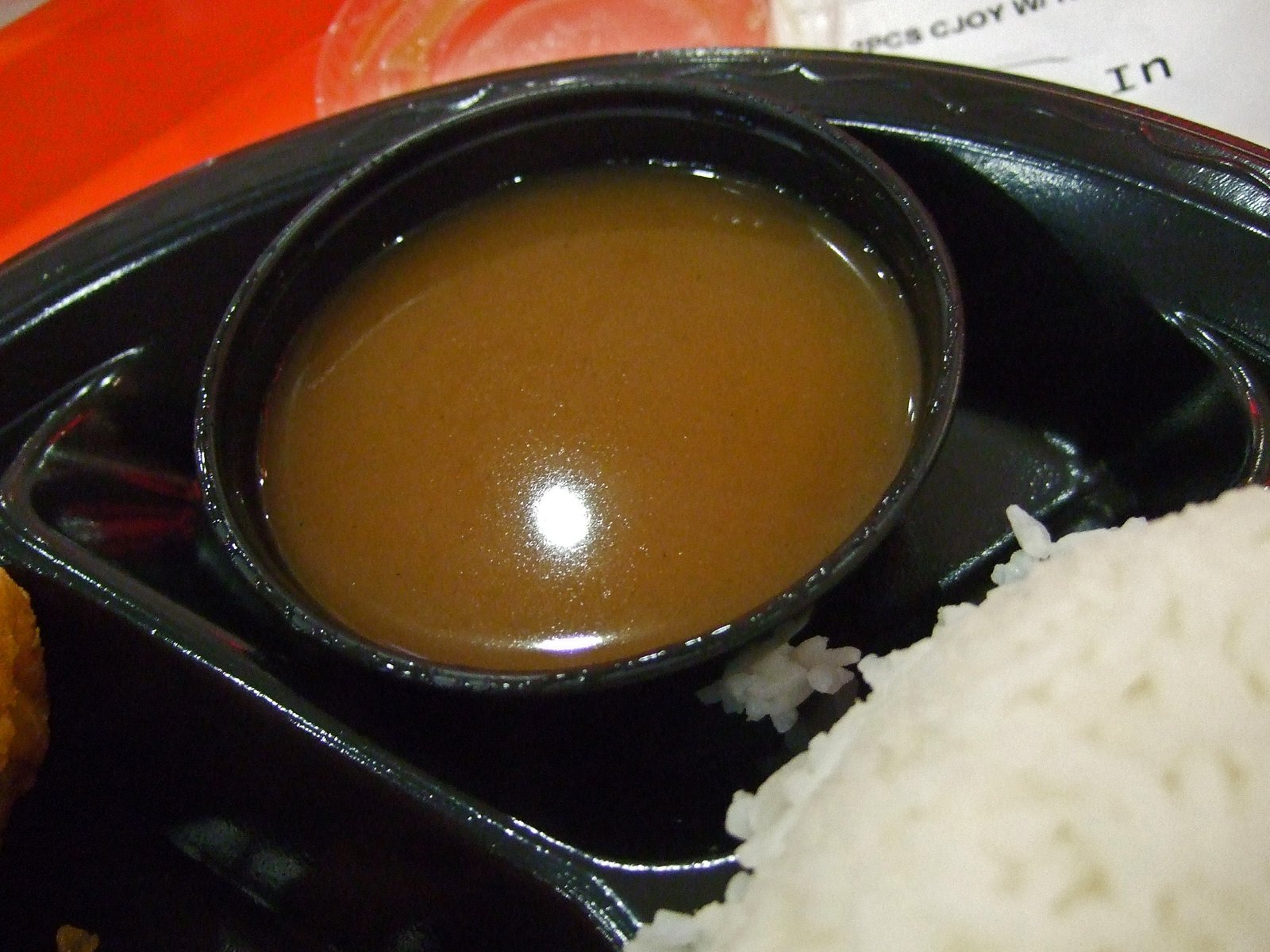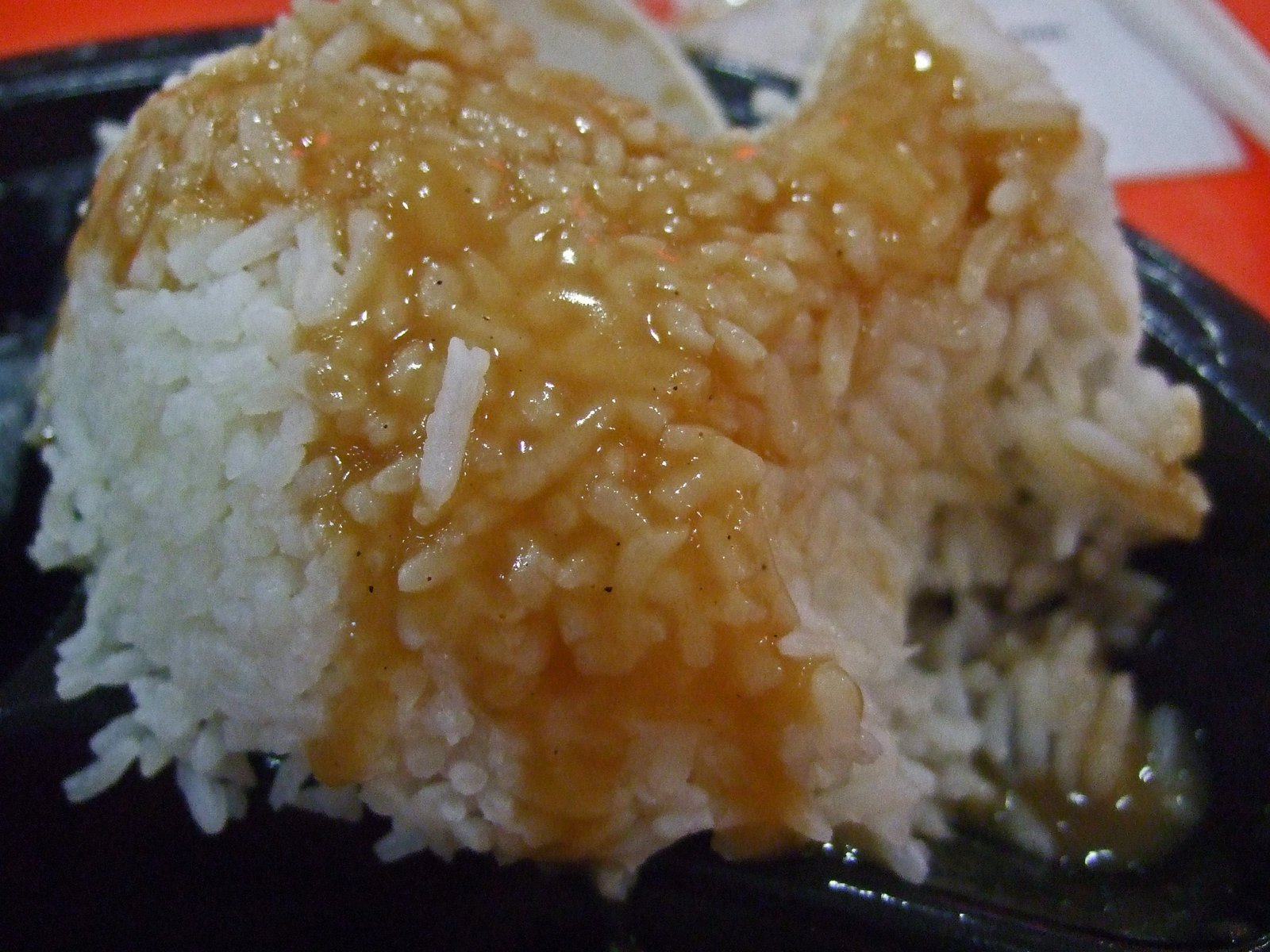 Though I find the batter a bit too crumbly, on this visit it wasn't quite as greasy as I remembered. The gravy has that strange artificial flavor, but you just can't help pouring it over the rice…..