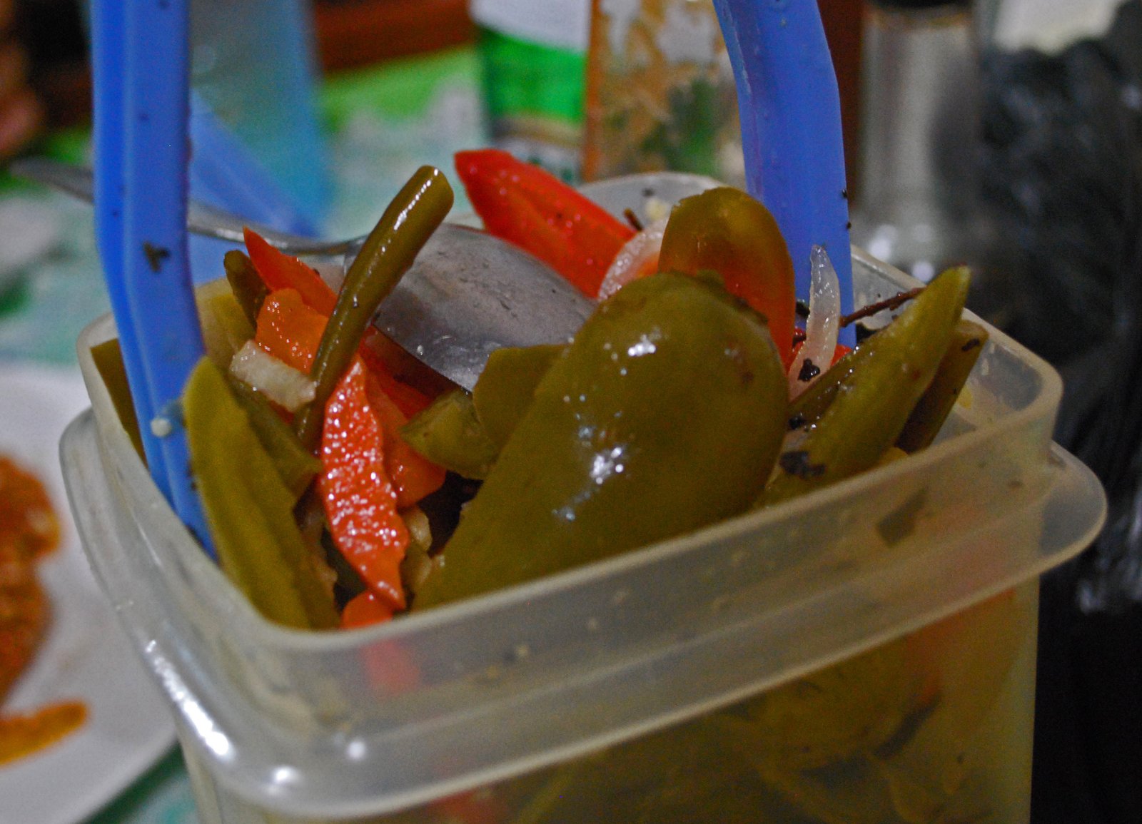 Luckily, I recalled one of the few words I had learned… "encurtido". And this time, the young lady could understand my mumblings. And soon a huge container of pickled veggies made its way to our table.