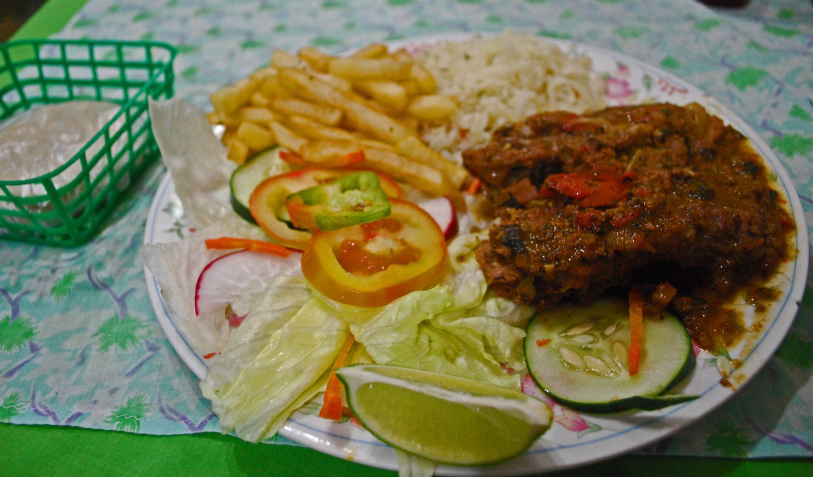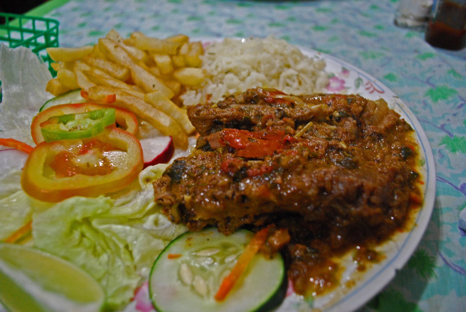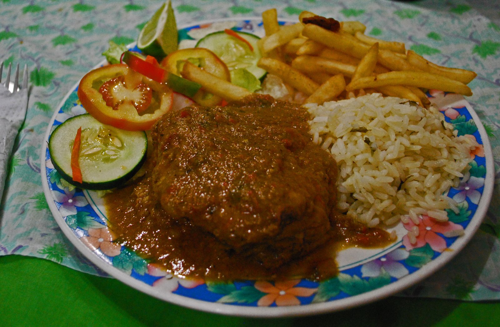 Along with the routine green salad and the three headed carb attack (papas fritas, tortillas, and rice), the beef was a pretty hefty sized slice of what appeared to be flank steak sauteed in a tangy tomato and oregano based sauce. The beef was on the chewy side, but not unpleasantly so, and this was not short on flavor.