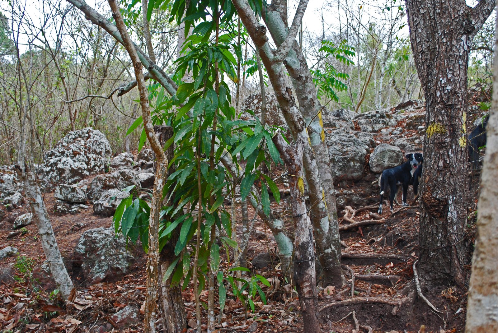 After lunch at Churrasqueria Mom's on the day of arrival in Copan Ruinas, the Missus decided that She just HAD to see Los Sapos ("The Toads"),an ancient site of rock carvings where women gave birth. Toads were a fertility symbol, and there are supposedly carvings of toads. I say supposedly, because after walking 8 kilometers in the hot mid-day sun, with the locals staring at the crazy tourists who were actually walking the hot, dusty trail of their own free will, uphill to Hacienda San Lucas,and paying admission, when we walked the trail to Los Sapos, the packs of dogs lying around the ruins spooked the Missus. Here's the photo of Los Sapos, you can see a few of the dogs in the right hand side of the photo: